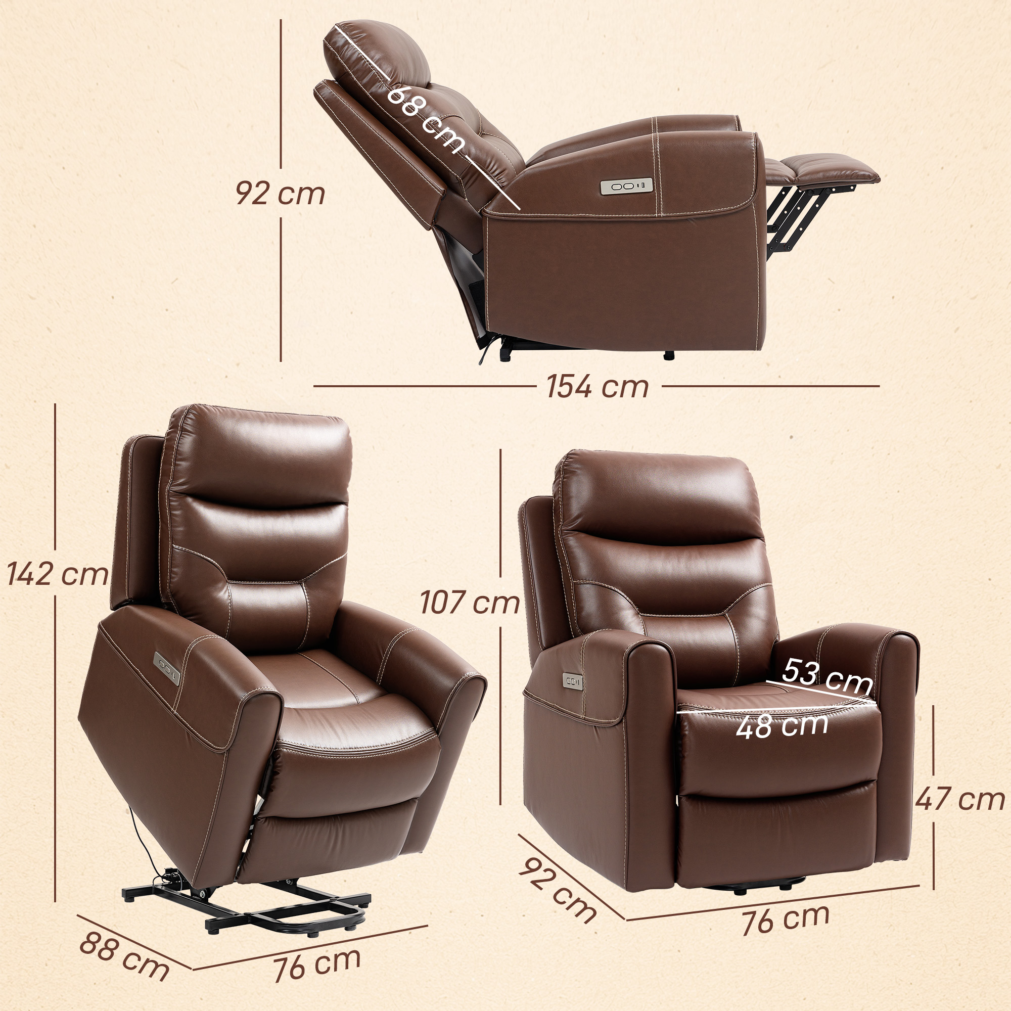 Discover the comfort of the HOMCOM Lift Recliner Chair, your new relaxation ally. This electric recliner chair gently lifts you to a near-standing position and offers heavenly recline up to 150°. Indulge in the plushness of its overstuffed, easy-to-clean PU leather seat. Plus, keep gadgets charged with handy USB ports—a great faux leather recliner chair for any modern living space.