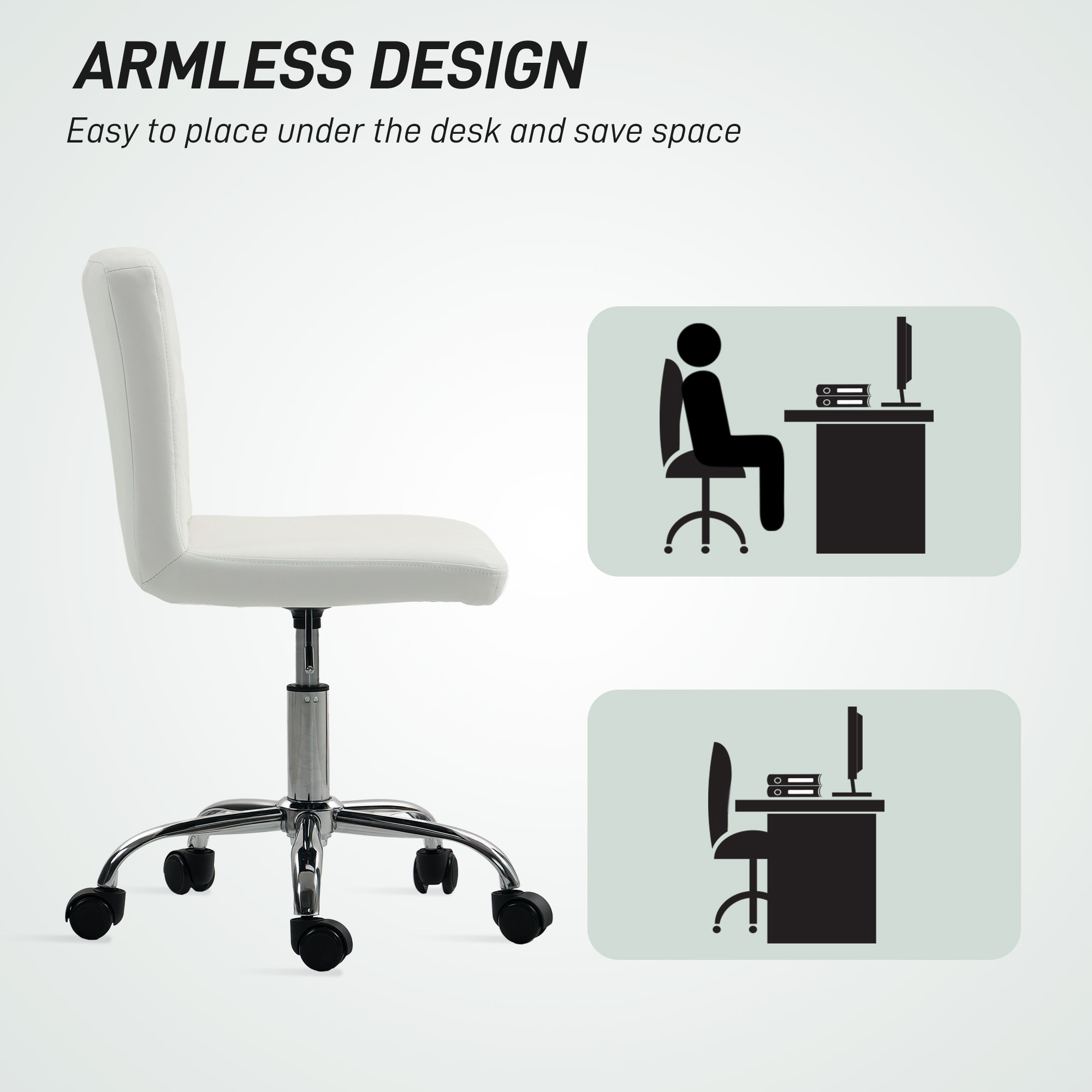 Discover the elegance of the HOMCOM comfy office chair, where button tufting meets practicality for your home office or vanity. This armless, space-saving design features a PU leather surface that mimics cat scratches for a unique texture that's both easy to clean and wear-resistant. Adjust easily with the study chair's smooth swivel seat and versatile height range, ensuring comfort and style in any setting.