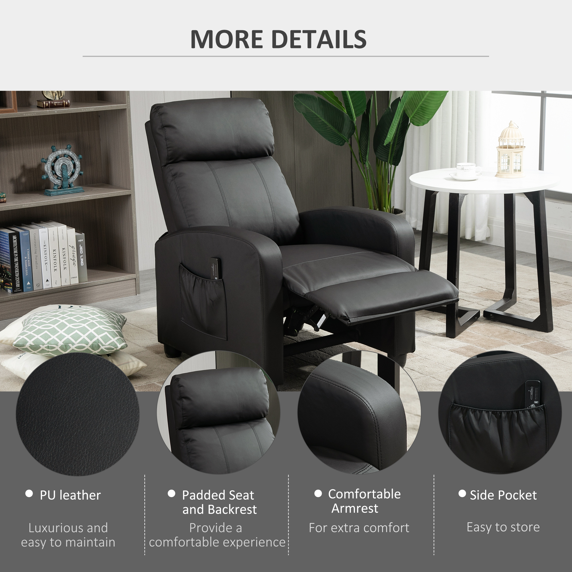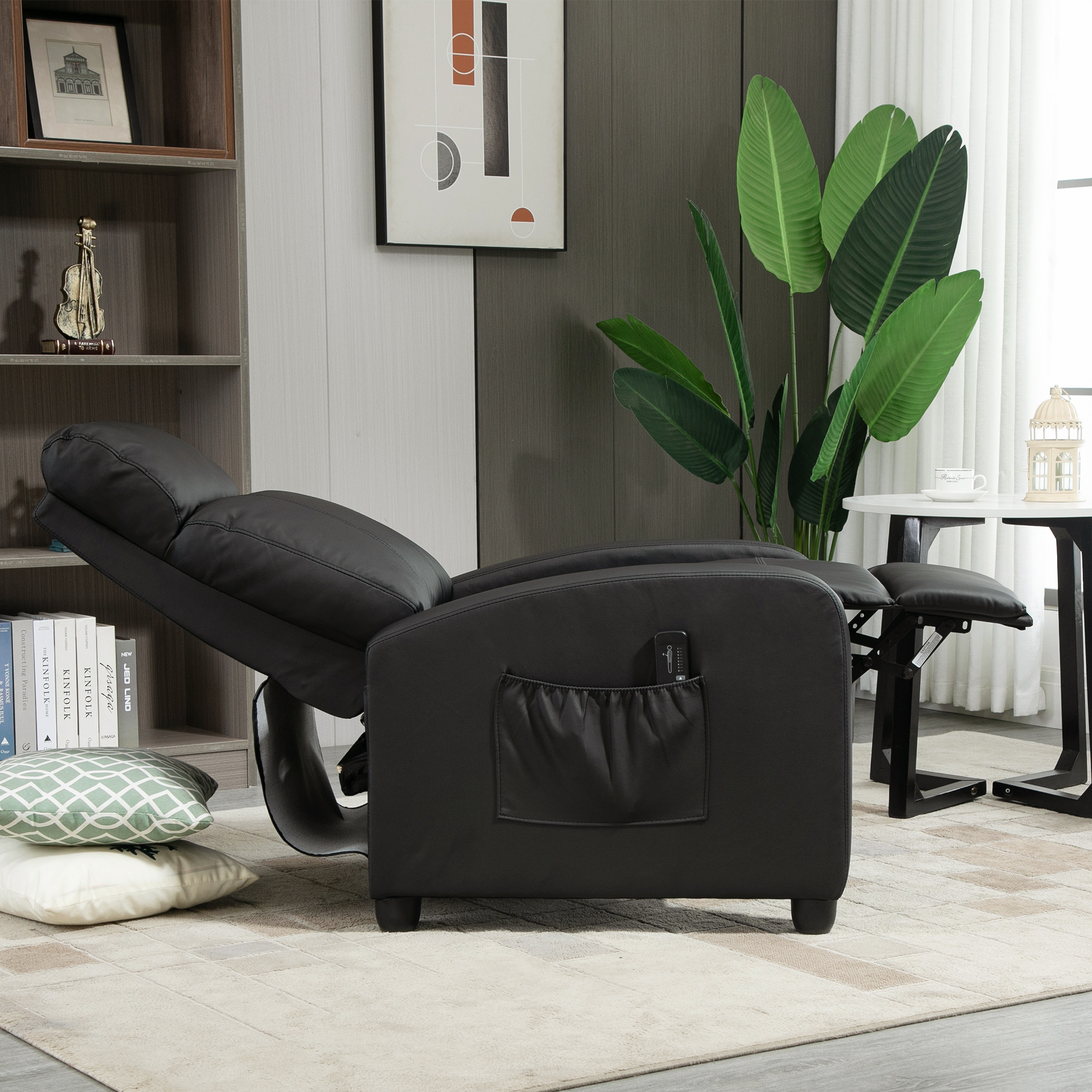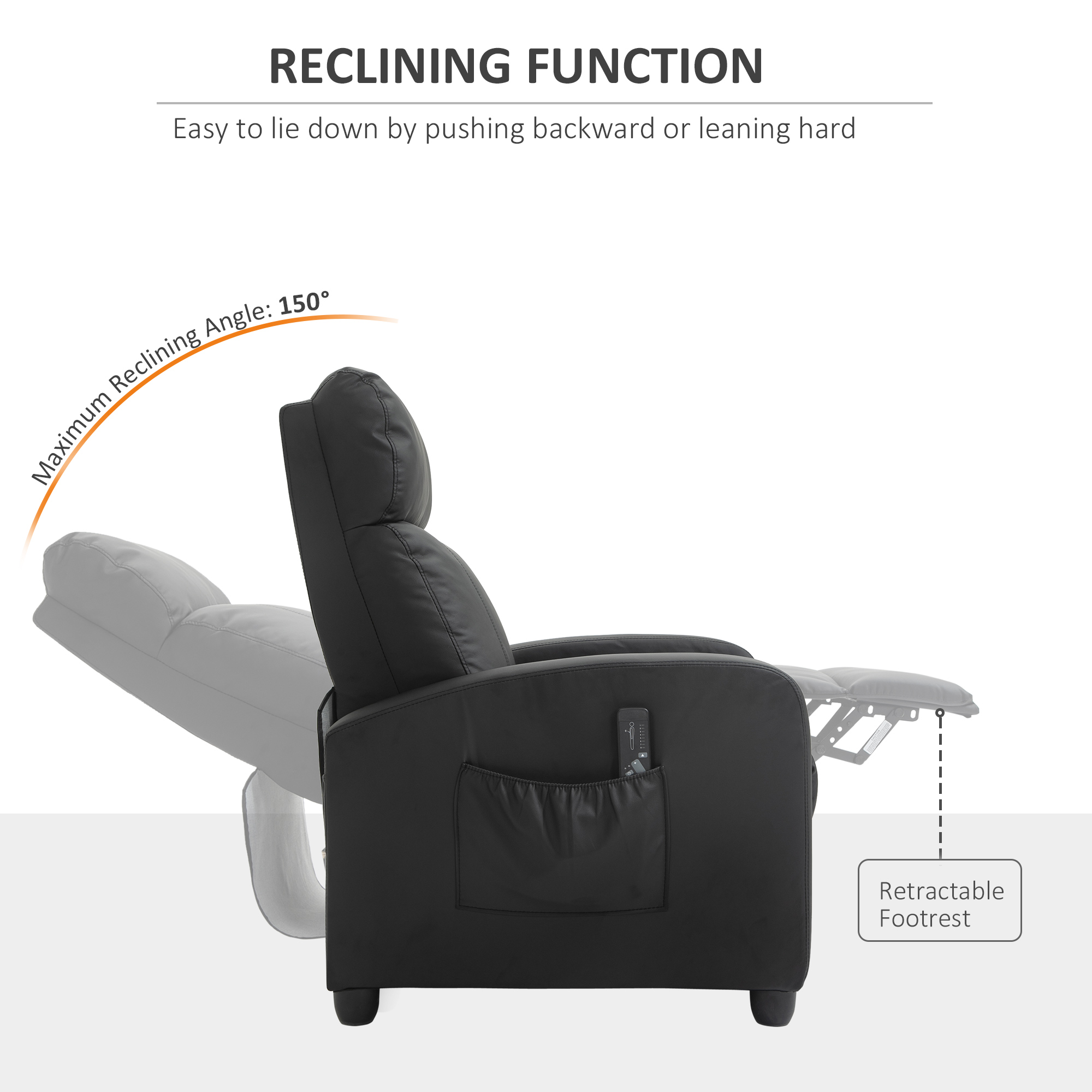 Let this reclining massage chair from HOMCOM take away stress and fatigue. Controlled by the included remote, it is fitted with two vibration massage points on the back, with eight different modes and five intensity levels to pick a setting which is most relaxing for you. The back manually goes back to maximum 150° so you can lean back and relax. It's filled with sponge for comfort, finished with smooth faux leather for a touch of timeless style.