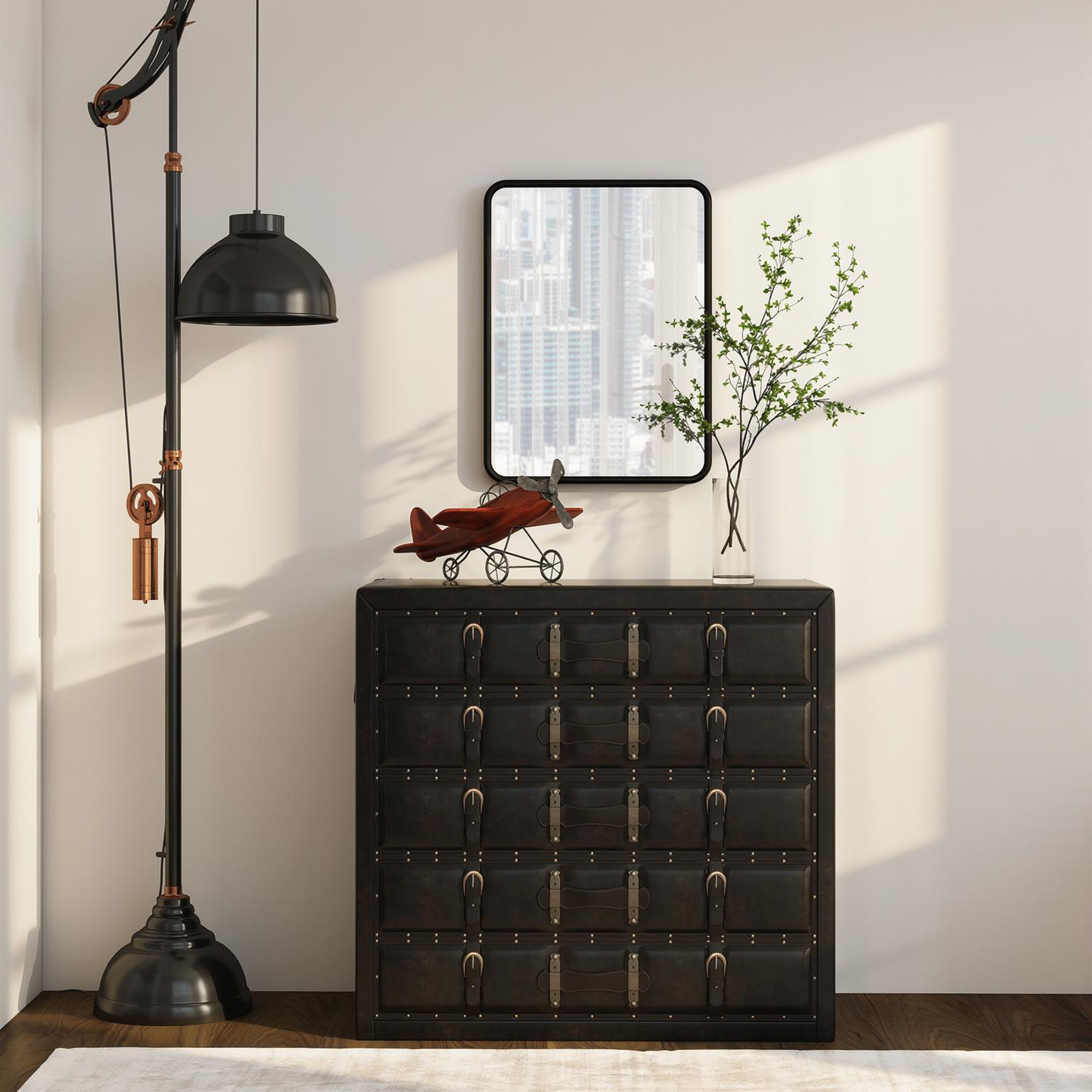 - Features a sleek black metal frame, adding a timeless modern touch