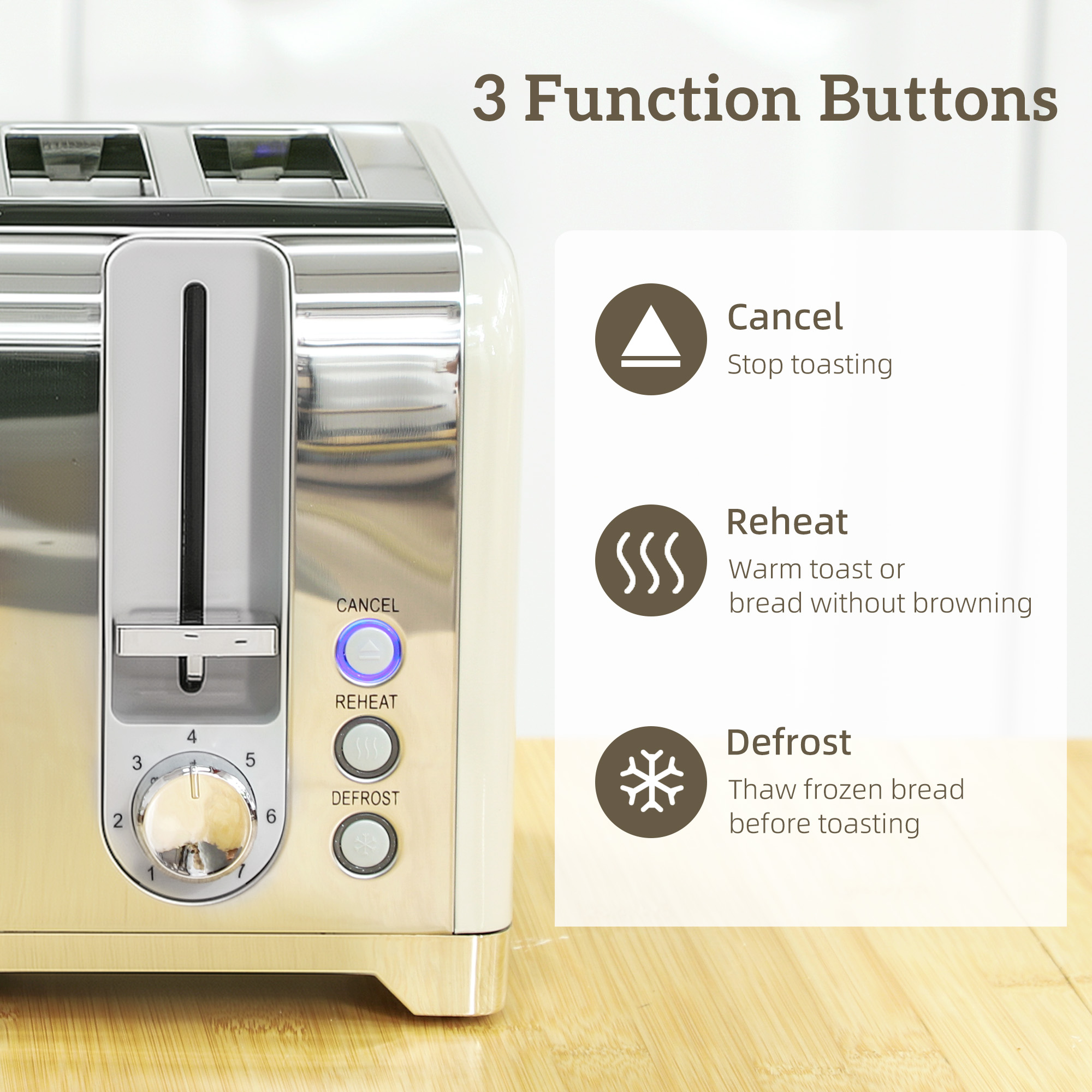 - Four-slice toast has seven browning levels. Defrost, reheat and cancel