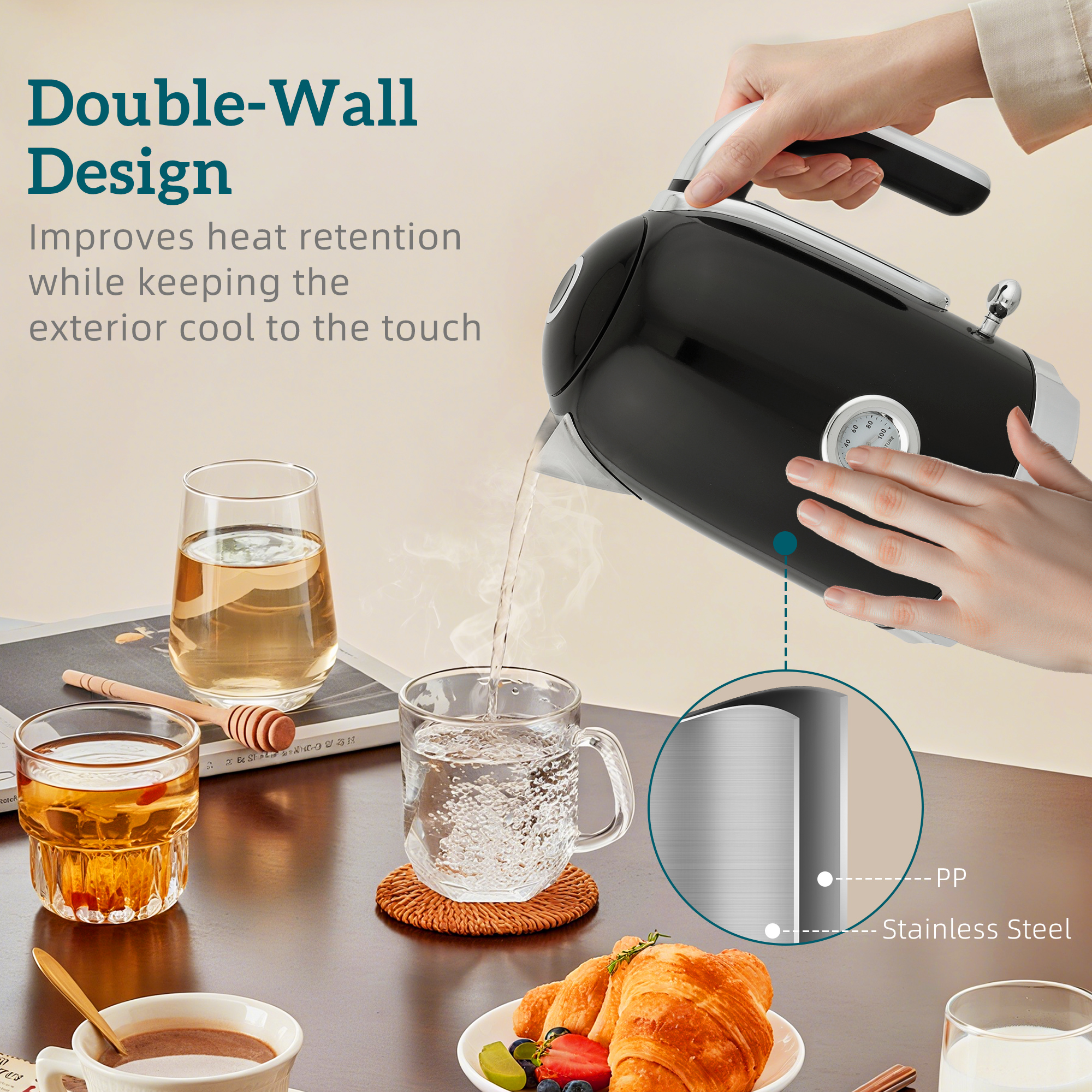 - 3000W 1.7L kettle - enough for seven cups. Front thermometer shows real-time water temperature