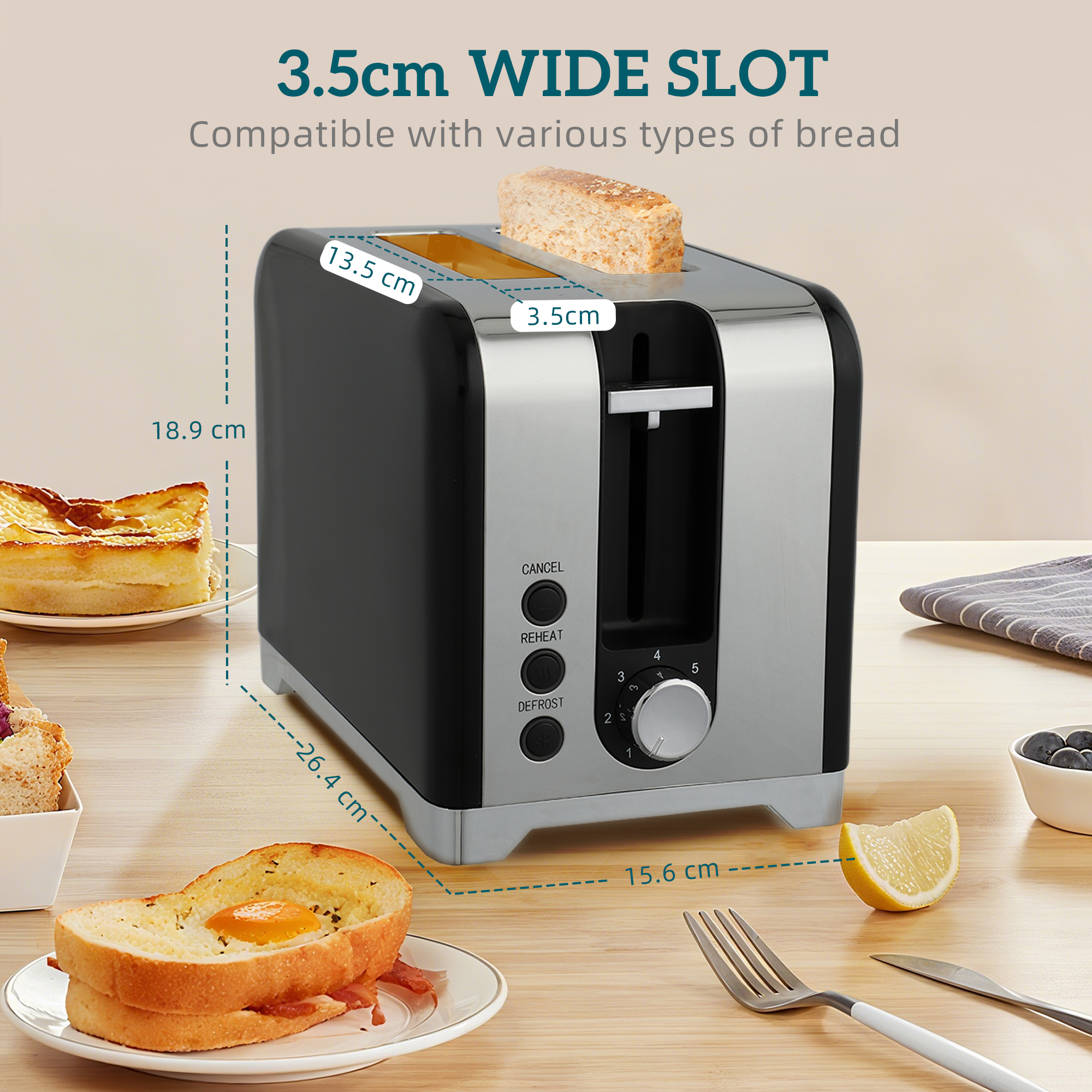 - Toaster Slot Size: 13.5L x 3.5W x 13.5H cm