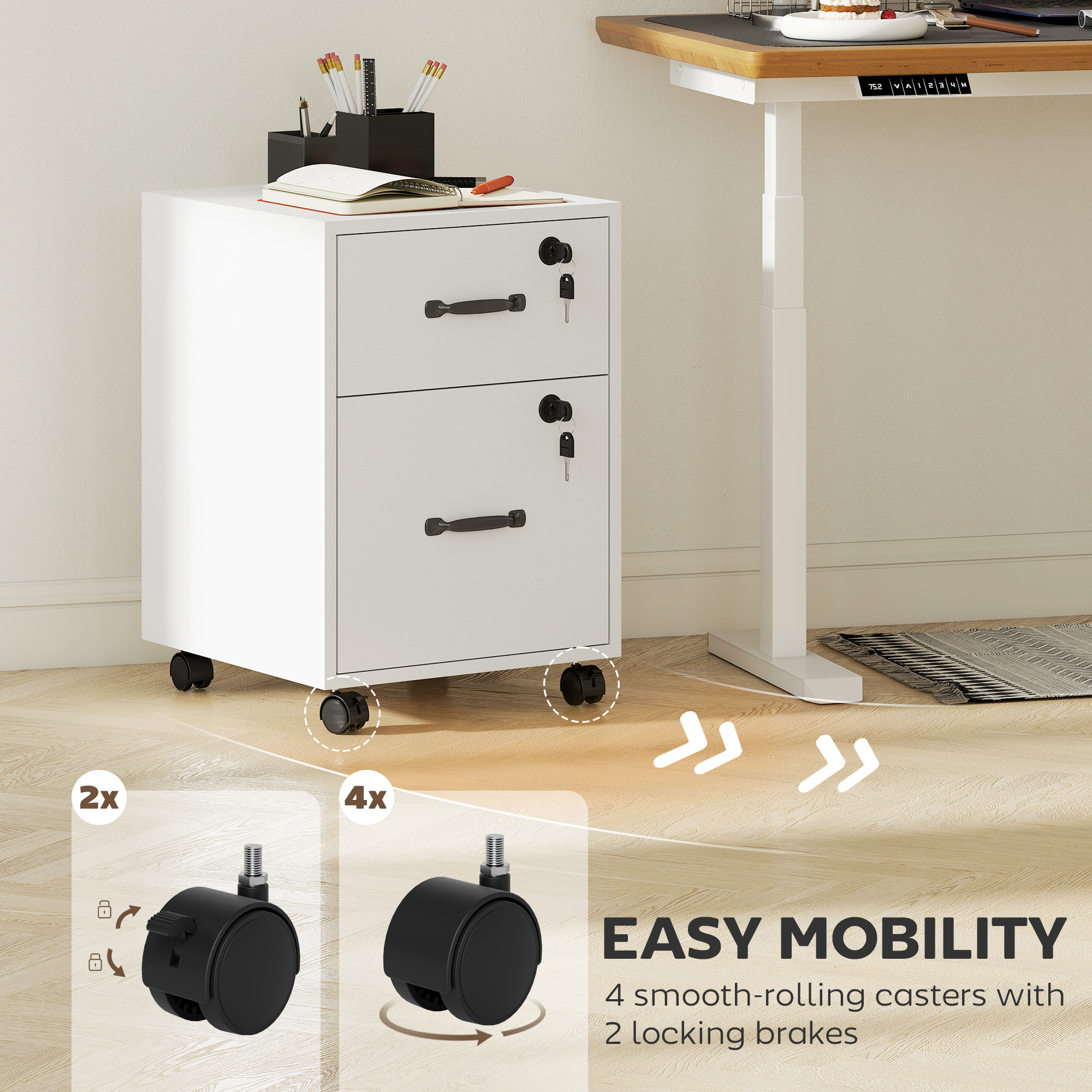 Blending storage space and a compact size into a sleek wood-effect design, this filing cabinet from HOMCOM is made to make you fall in love with your office space once again. It features a small top drawer and a large bottom drawer to give you all the room needed for files and stationery. There is a rail in the bottom drawer for hanging your letter files for organisation. Four wheels are fitted on the bottom for easy movement - two of which can be locked to keep the unit in place when needed.