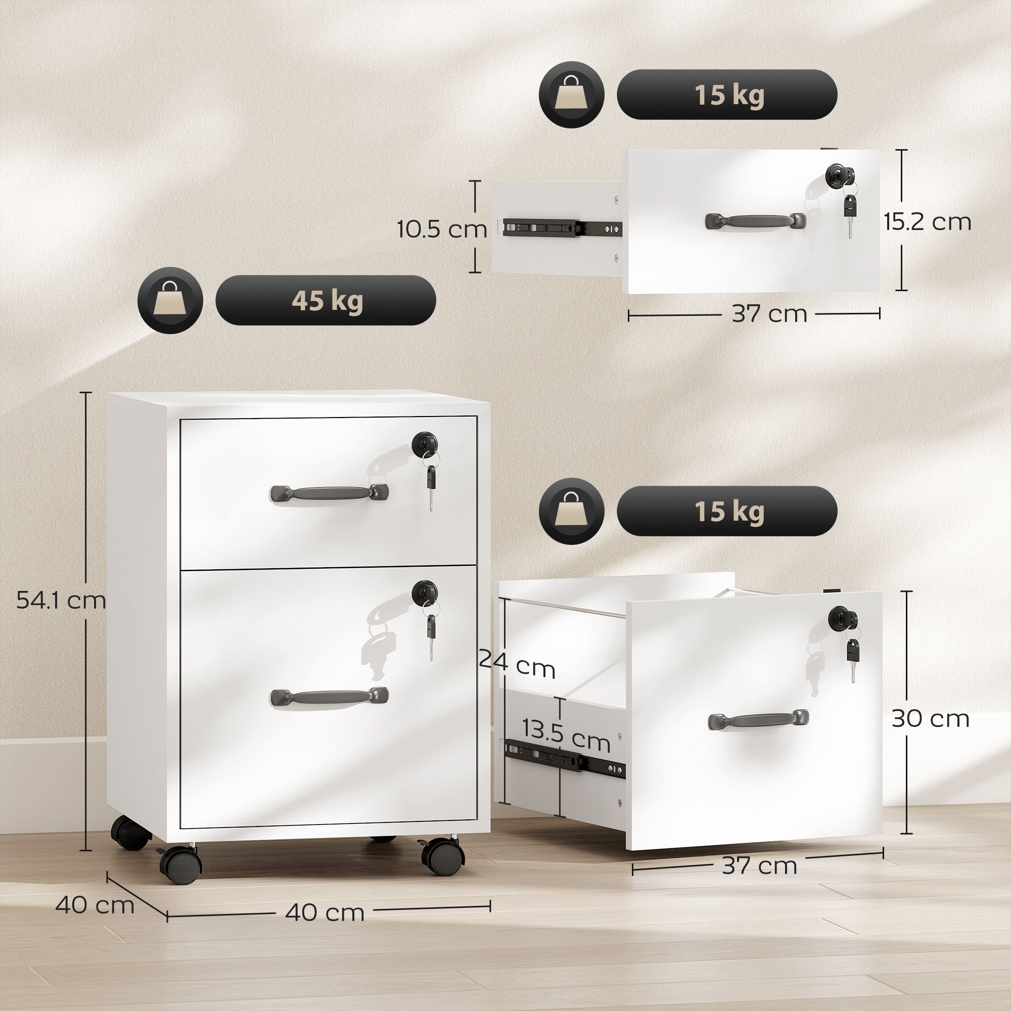 - Max Load: 15 kg (cabinet top/drawer), 45 kg (total)