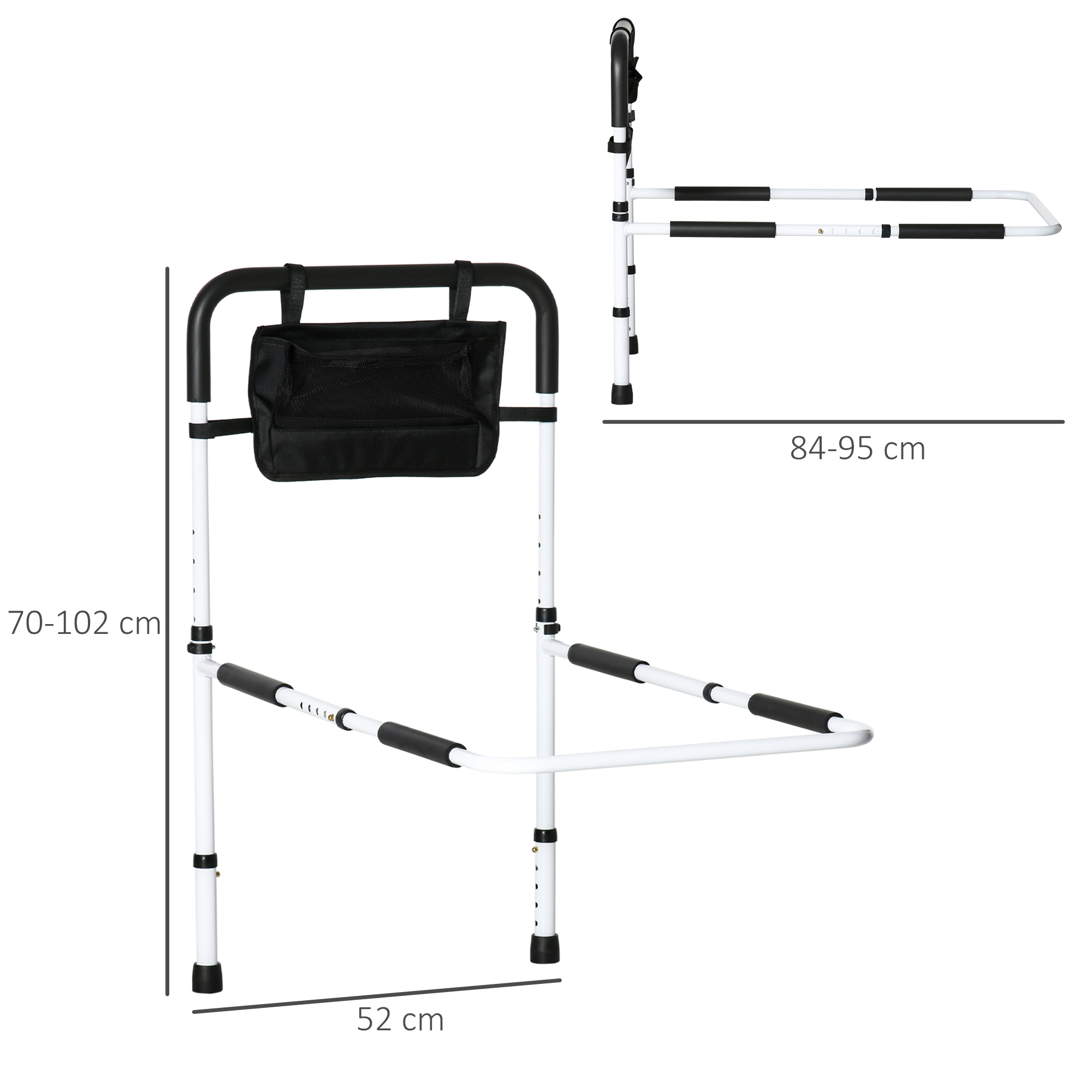 This HOMCOM bed support rail provides secure support for anyone who requires assistance getting out of bed. The steel structure is covered in soft foam, making the hand grip comfortable and secure to hold. It can be adjusted to different height and length, allowing you to set to a level safe for you. In addition, finished with a side pocket to keep what you need near you, and is easy to attach with the included clip-band. Please note: the size of the mattress must be the same as the bed frame.