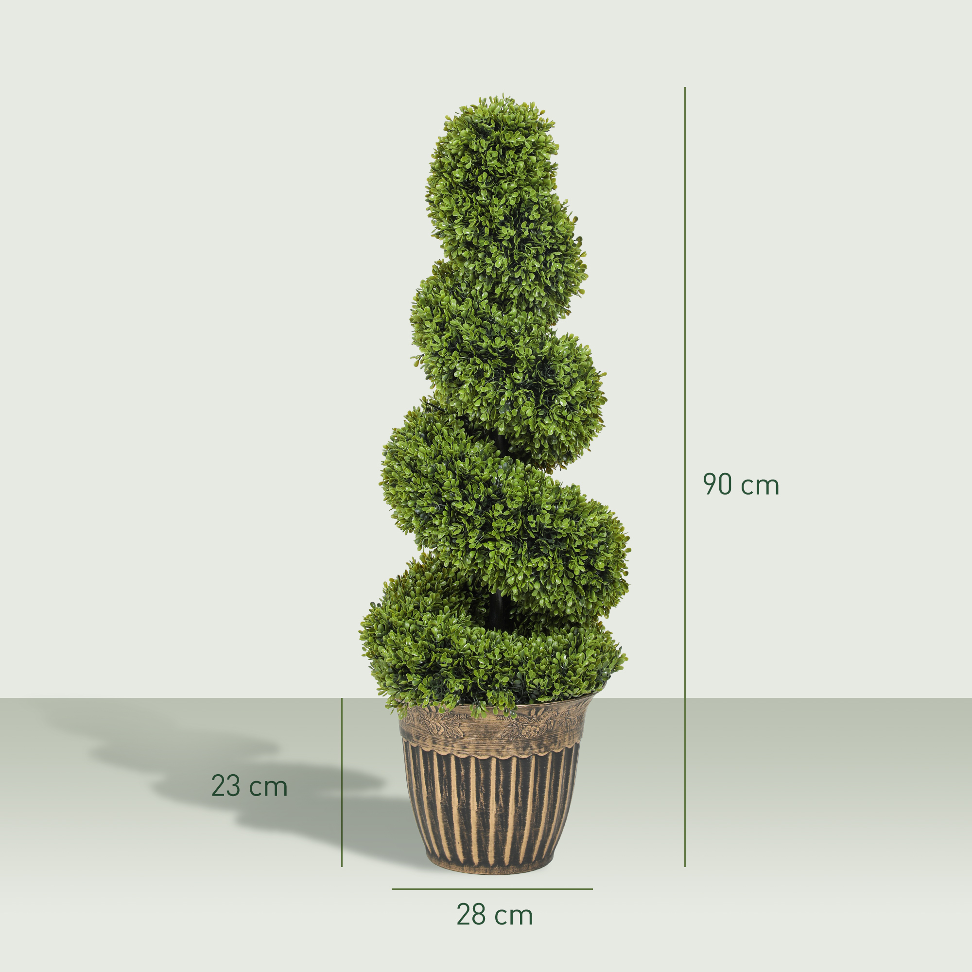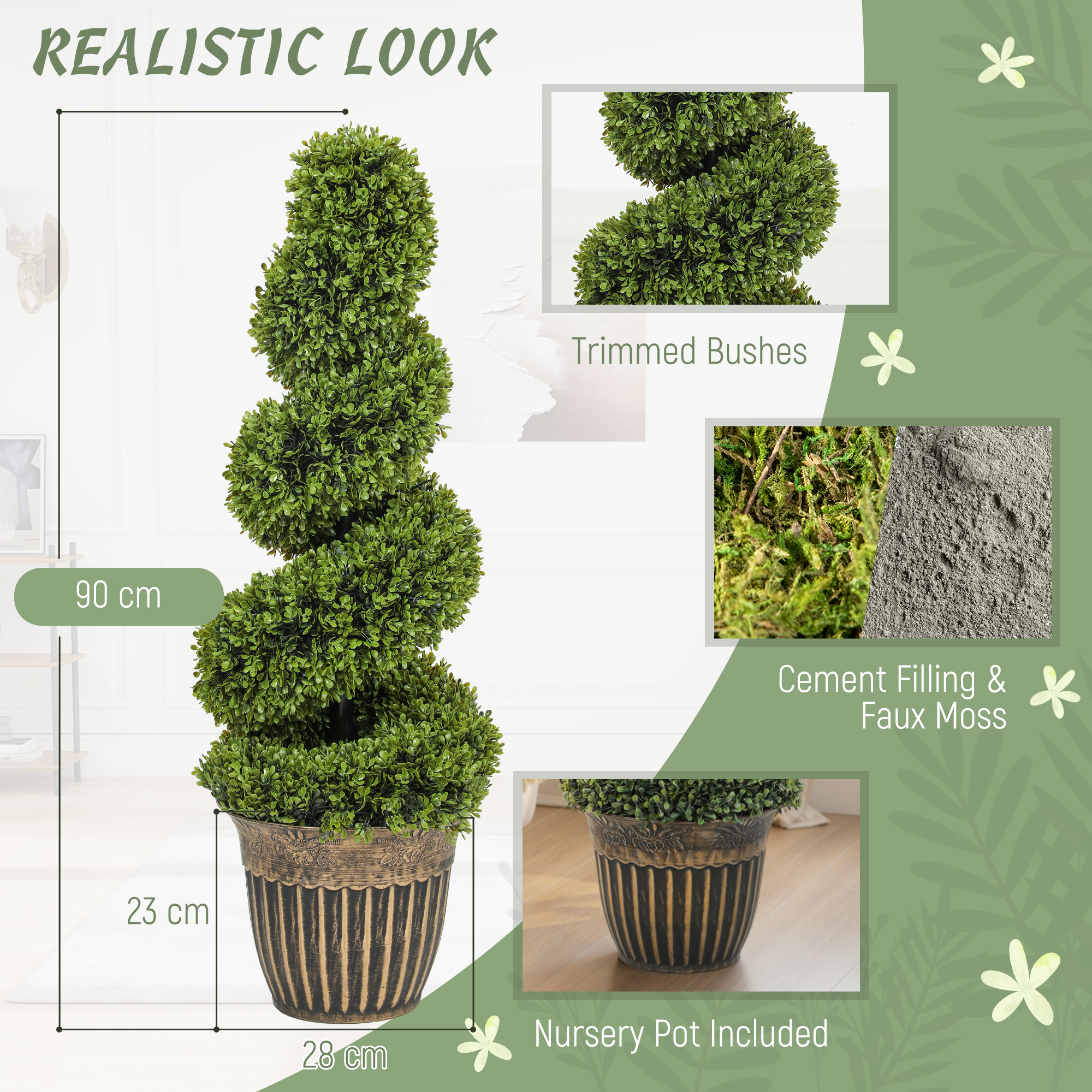 Green plastic plants, all year round with these two HOMCOM spiral boxwood trees. The faux plants will stay green for many years; no trimming or shaping required. Each plant has 1000 leaves - realistic colour and texture for a realistic look. They come with cement-filled pots to keep weighted.