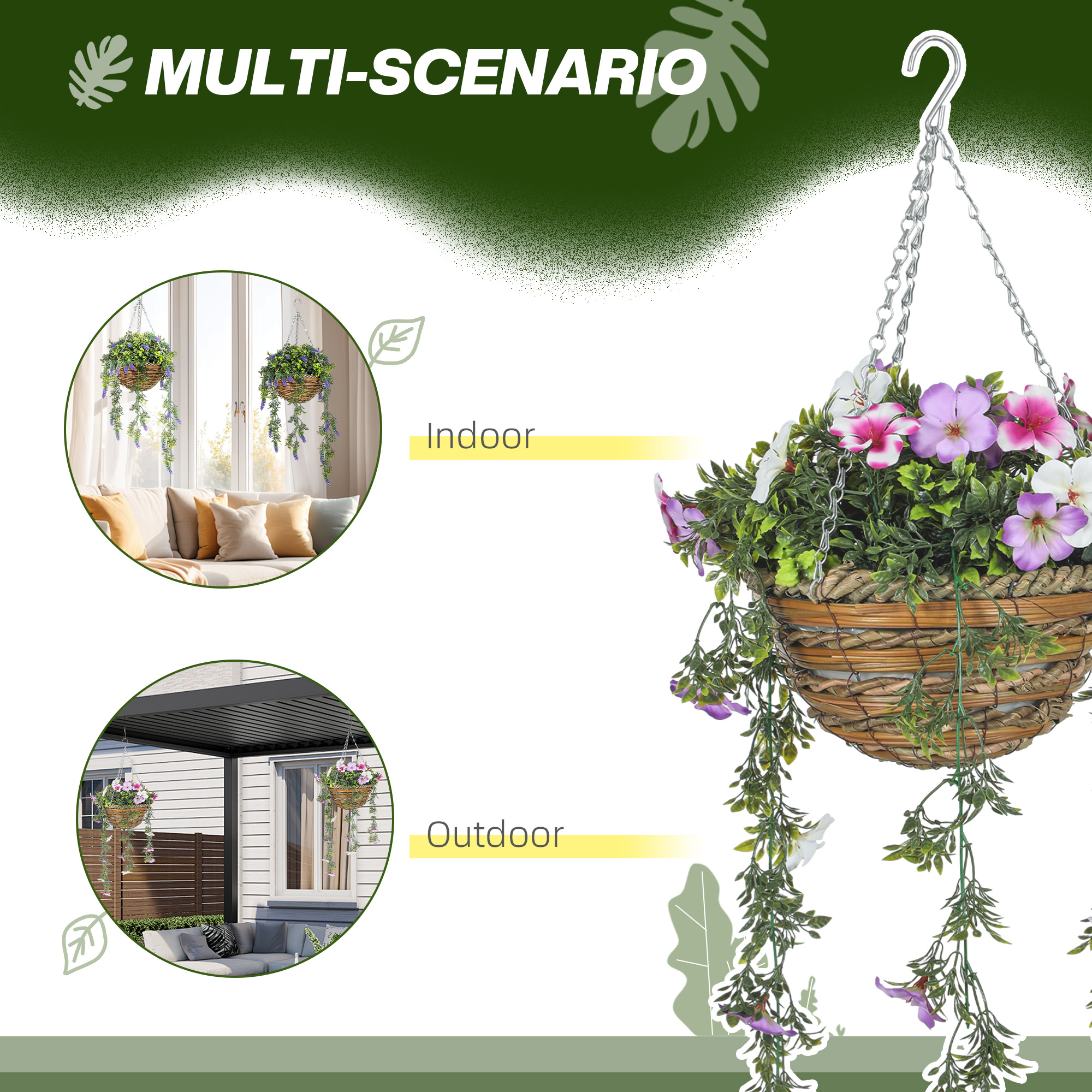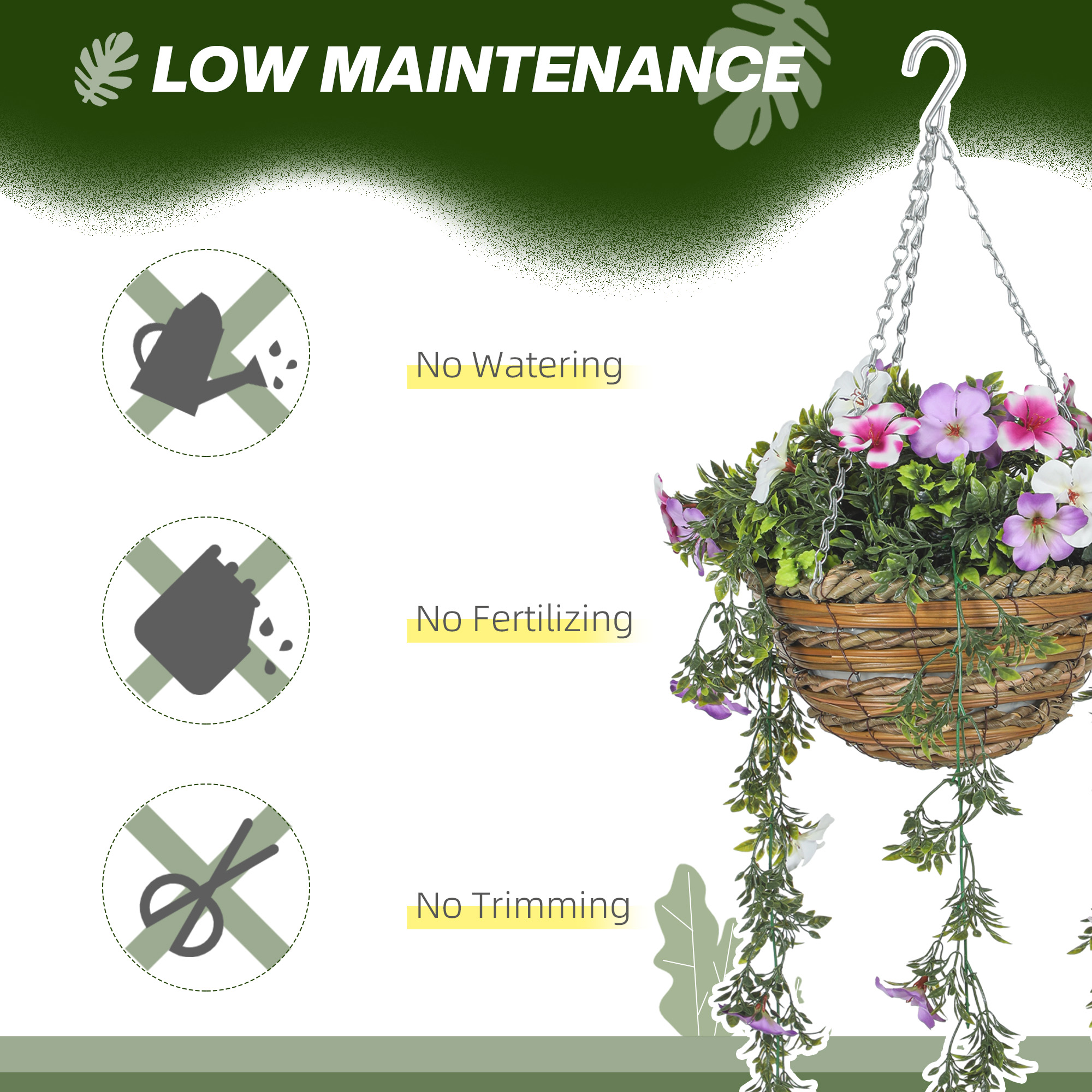 Transform your space with the HOMCOM two set of hanging baskets azalea flowers. These artificial plants boast UV protection for both indoor and outdoor charm, their natural texture delivers an astonishingly realistic look. Enjoy the beauty of fake plants year-round without the fuss, all while enhancing your decor with their evergreen elegance. Great for those who appreciate low-maintenance yet stylish accents.