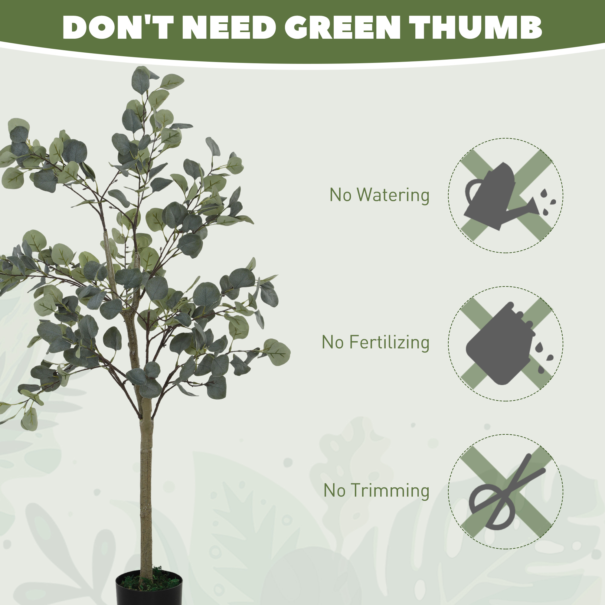 Transform your space with the HOMCOM Artificial Plants, featuring 230 lush silver dollar leaves for a stunningly realistic look. These faux plants for indoors boast silk leaves and lifelike trunks, complete with simulated moss, ensuring a fresh, verdant touch year-round, symbolizing healing, renewal and resilience. Enjoy the beauty of an indoor plant without any upkeep—no watering or sunlight needed!