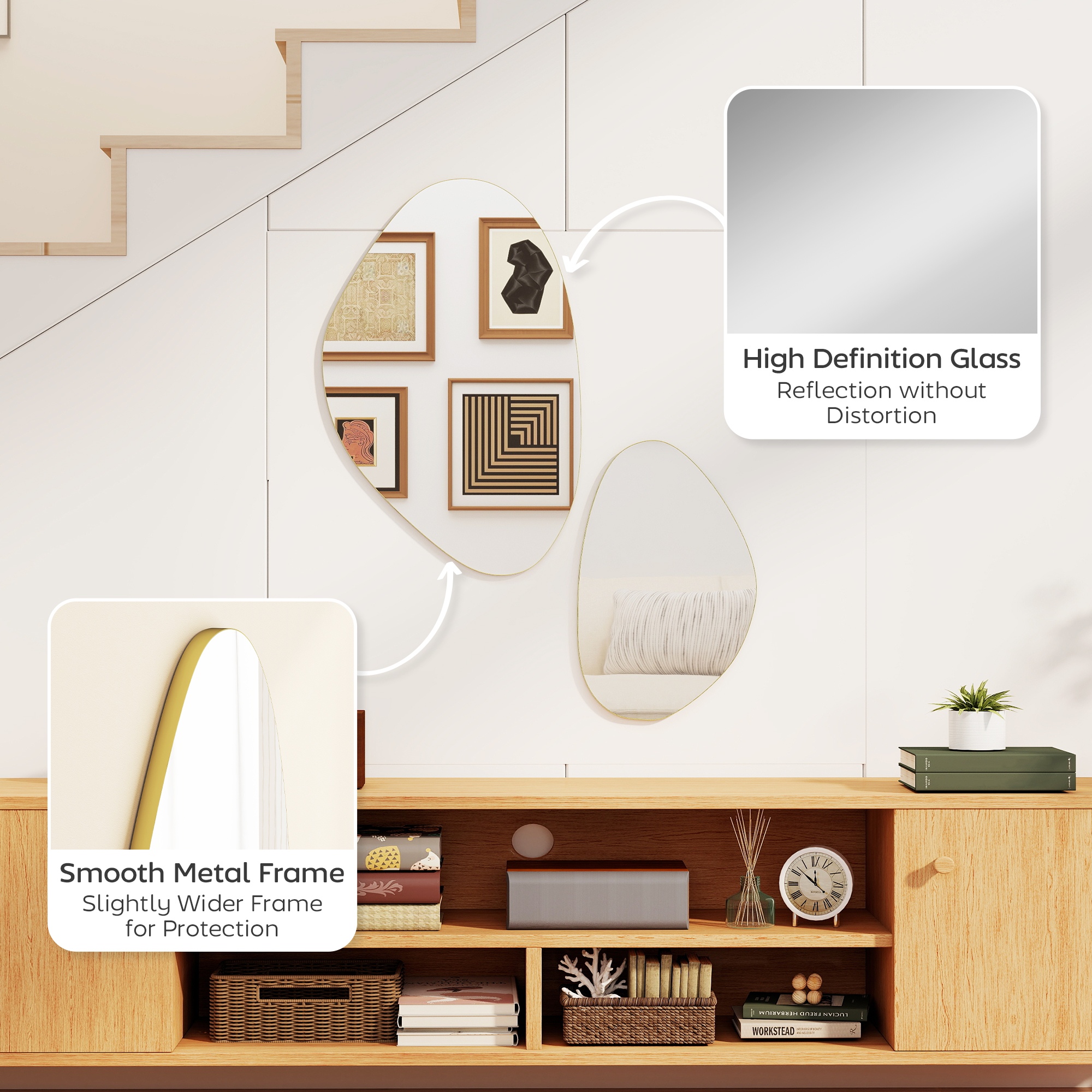 Tired of blank walls that lack personality? Finding decor that's both striking and long-lasting can be a challenge. Elevate your space with the HOMCOM living room mirror set. Its unique pebble-shaped design sparks conversation, while the reliable metal frame and MDF construction ensures lasting durability. This coordinated duo brings artistic harmony and modern elegance to your home, reflecting your distinctive taste in every glance.