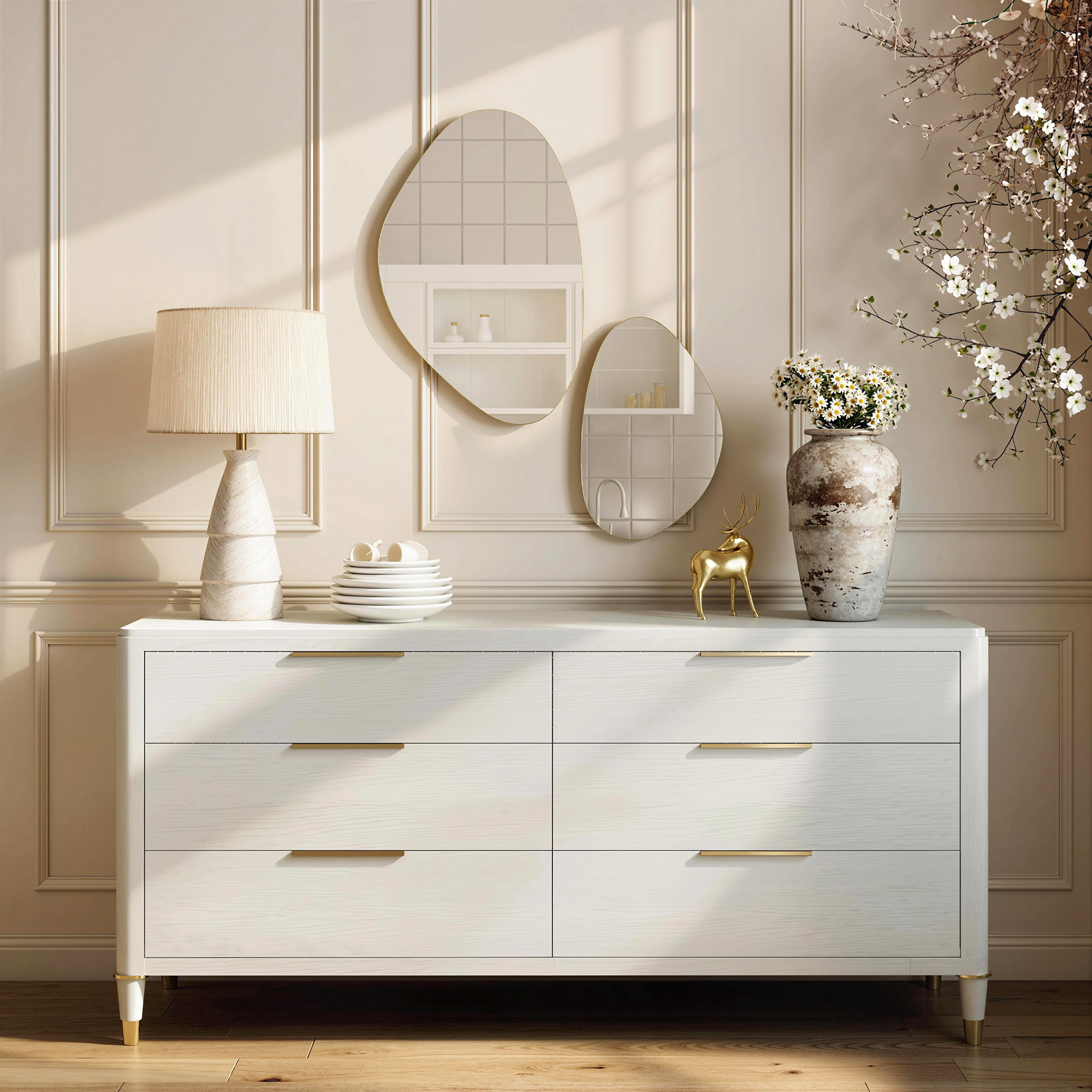 - Features a two-piece pebble mirror set for unique, artistic wall arrangements