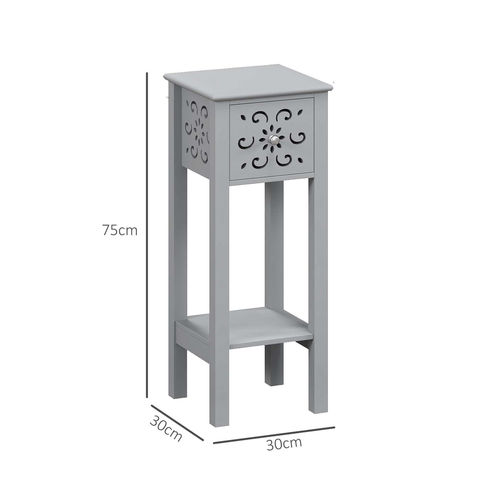 Bring the beauty of floral into the everyday, with these two HOMCOM side tables. In grey, with a floral shaped cut-out on the top, both small side tables are elegant. They features a drawer, bottom shelf and flat top to hold plenty close to you. Complete with anti-tipping straps to safely fix to a wall.
