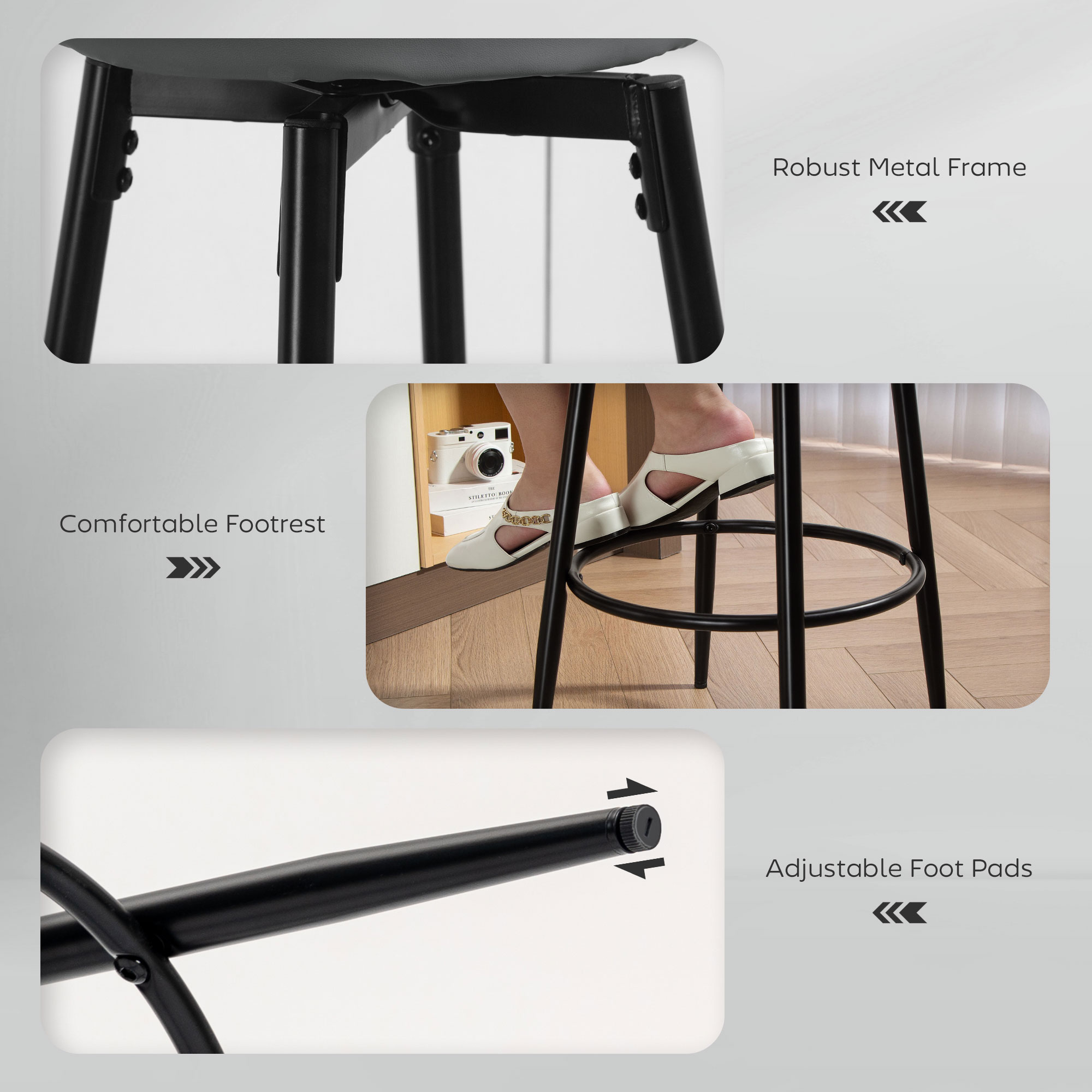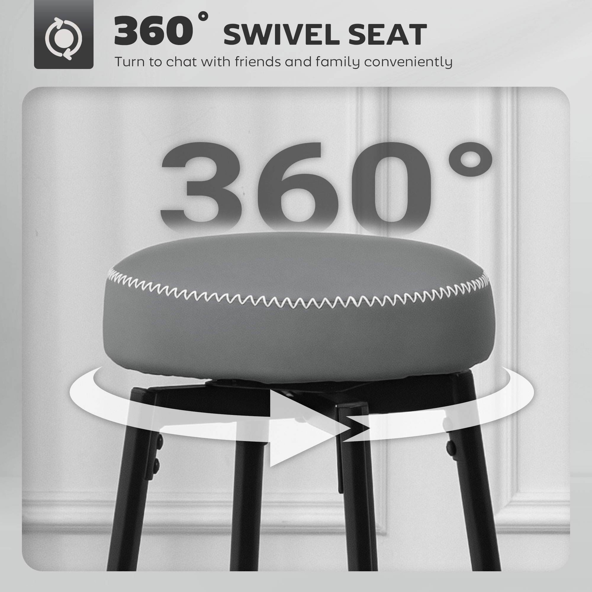 Style, with subtle contrast - look to this set of two HOMCOM bar stools. With faux leather upholstery for a sleek look - the white threads on the edges brings a touch of difference. The 8 cm thick foam cushion keeps you comfortable - ideal for extended times dining and more throughout the home. The powder coated metal frames mean strong, supportive cores - finished with adjustable feet for balance.