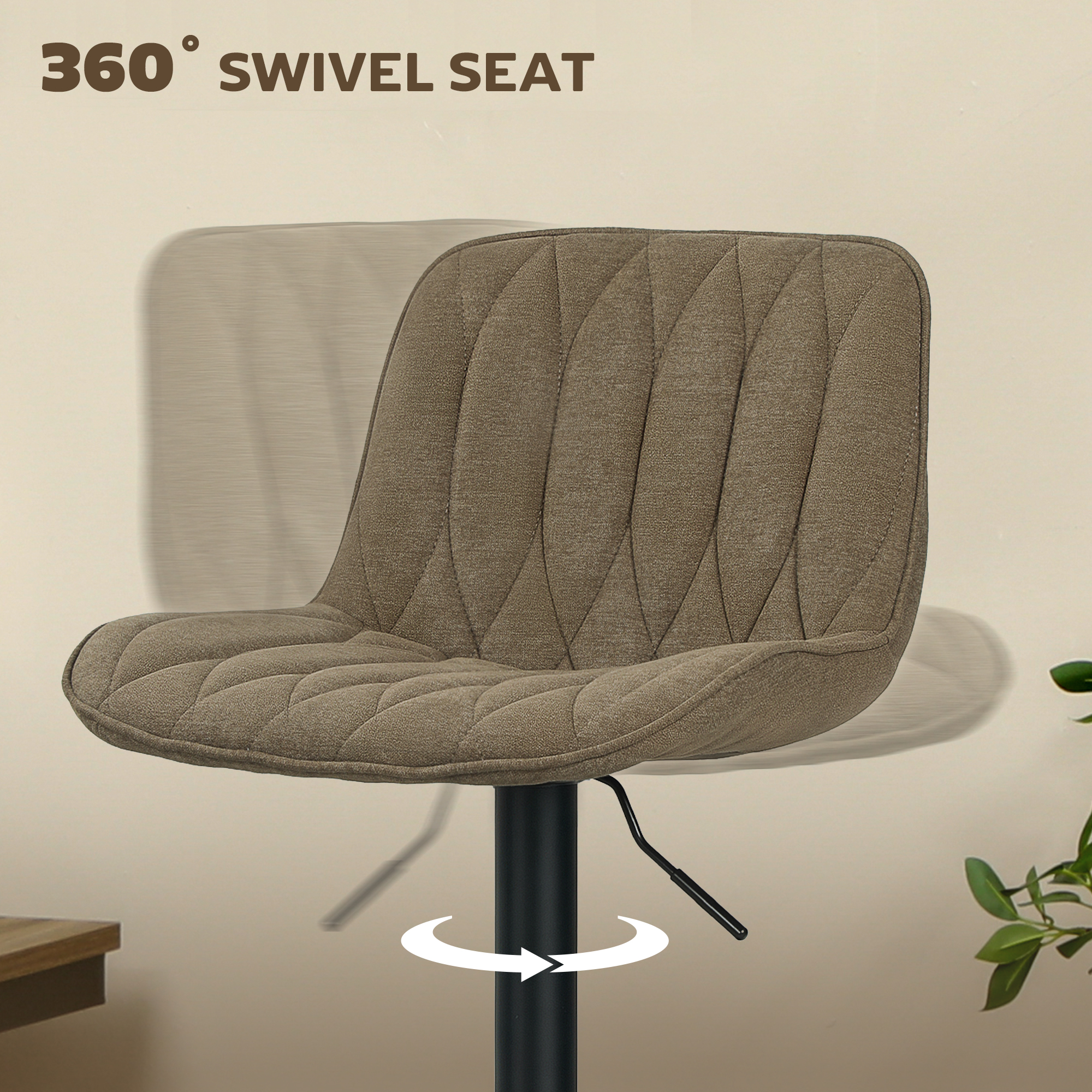For every raised surface, these two HOMCOM bar stools are the ideal fit. Adjust the seat height between 60-80 cm, to match kitchen islands, countertops and other. The powder coated steel frame ensures a strong core; the 360° swivel motion moves with your body. The padded seats keep you comfortable all day long, finished with supportive high back and smooth linen-look upholstery.