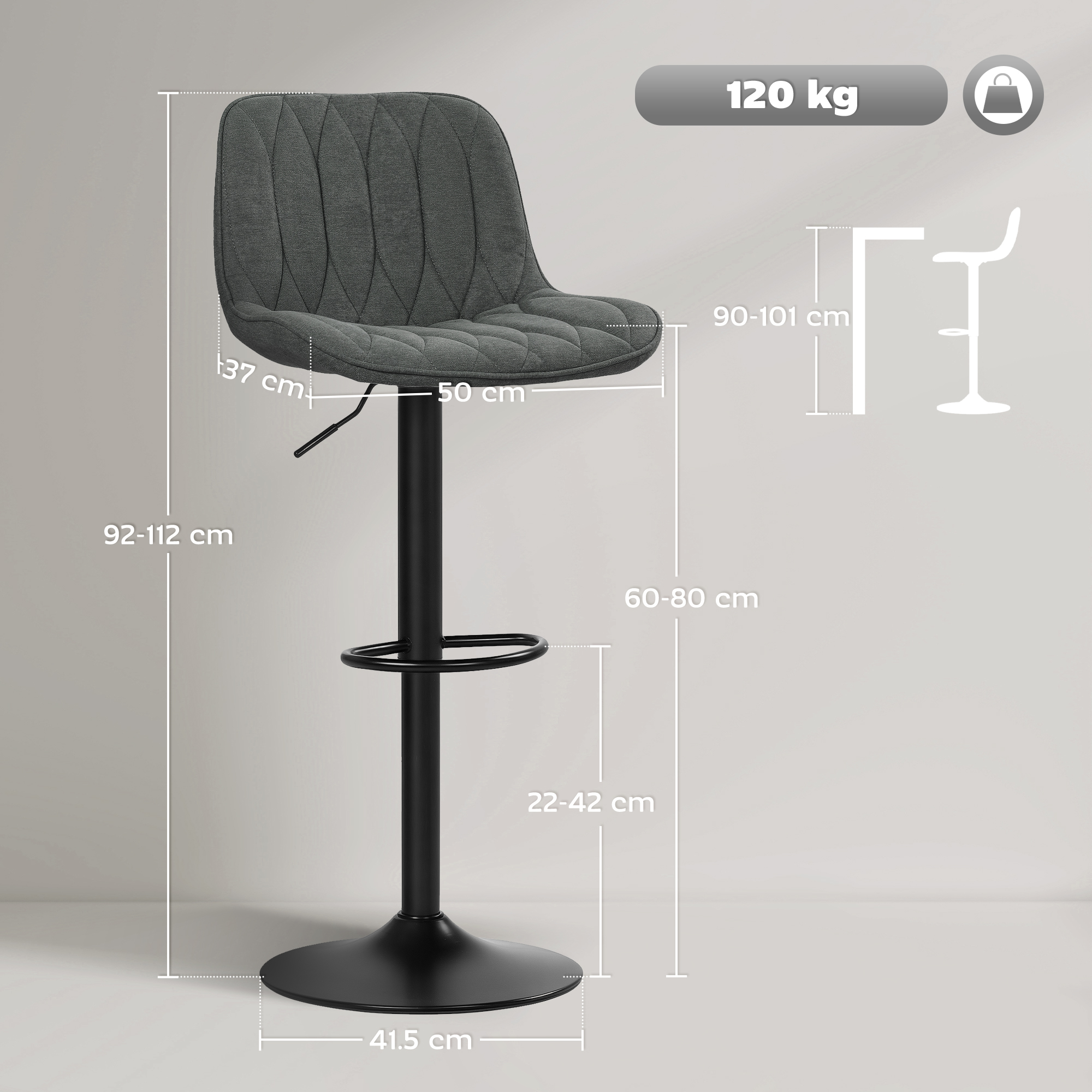 For every raised surface, these two HOMCOM bar stools are the ideal fit. Adjust the seat height between 60-80 cm, to match kitchen islands, countertops and other. The powder coated steel frame ensures a strong core; the 360° swivel motion moves with your body. The padded seats keep you comfortable all day long, finished with supportive high back and smooth linen-look upholstery.