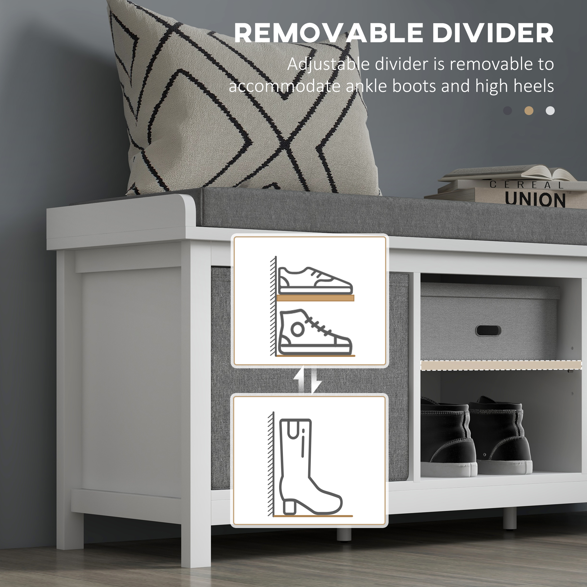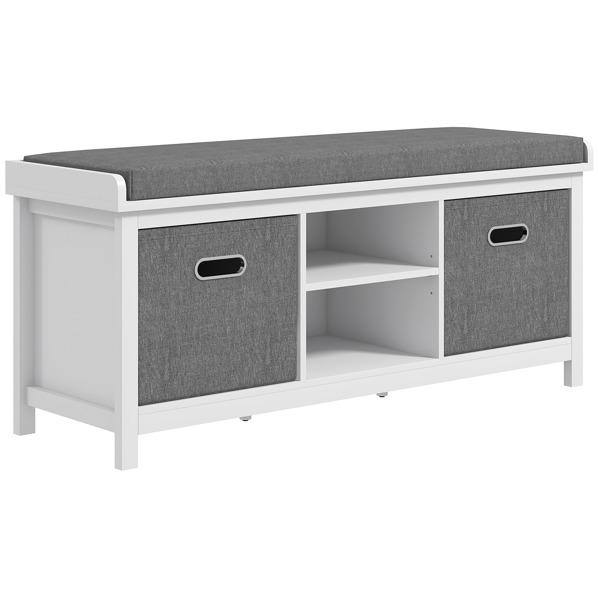 Organise shoes, with a handy place to sit with this HOMCOM shoe rack bench. Two fabric drawers and two shelves offer plenty of room for footwear and soft furnishings. Made from particle board, this shoe storage with seat is a sturdy piece suitable for everyday use, with a smooth and protective melamine coating. Complete with a padded top seat, to sit when needed.