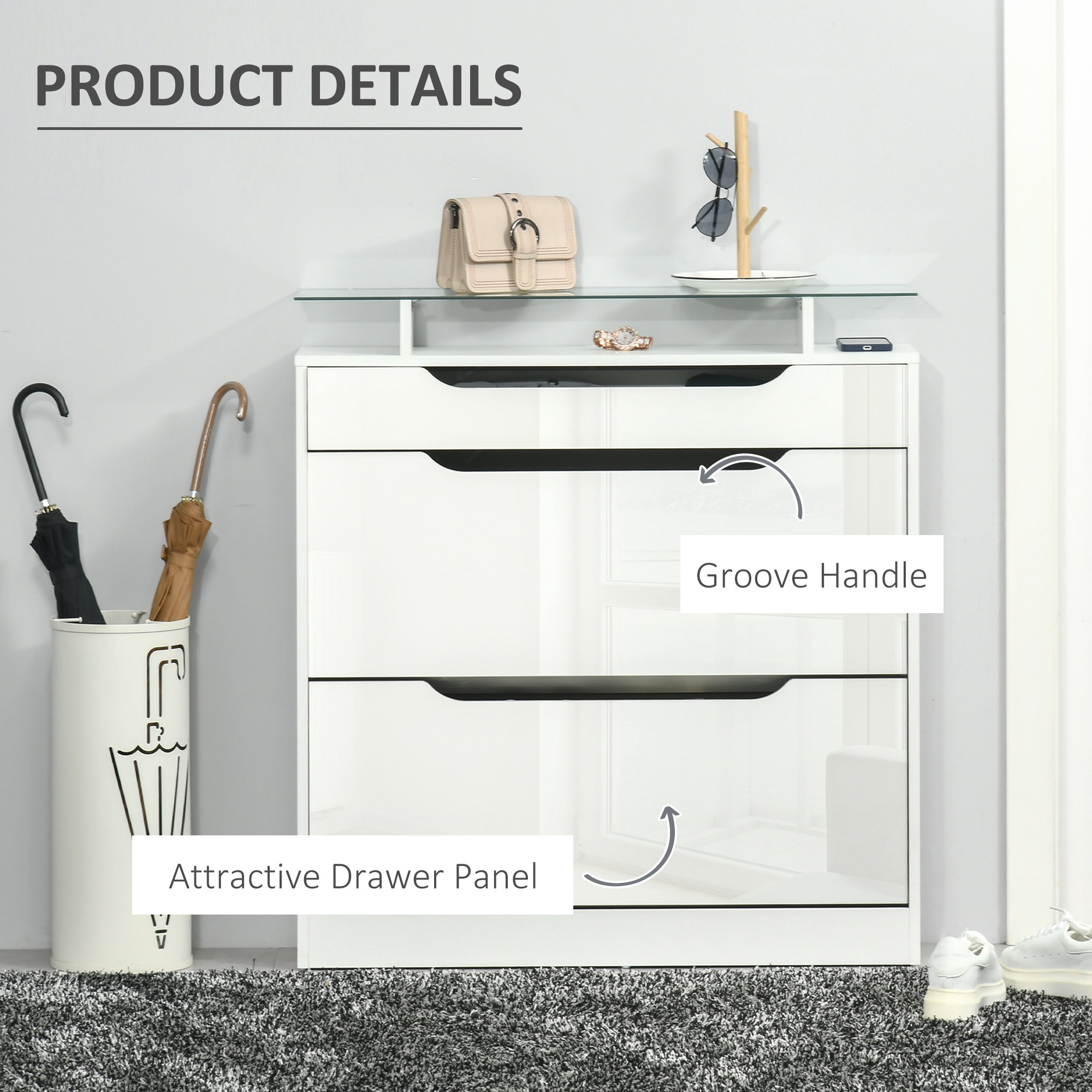 Give shoes and more somewhere stylish and protective to keep them - grab this narrow shoe cabinet from HOMCOM. There are two flip drawers, each can hold eight pairs - great for use with the family or your flatmates. The inner shelf can be set to two different positions for storage, which fits your shoes better. This tall shoe cabinet is made from a blend of MDF and particle board, so it's robust. Finished with a handy top drawer and glass shelf, offering even more storage and display space.