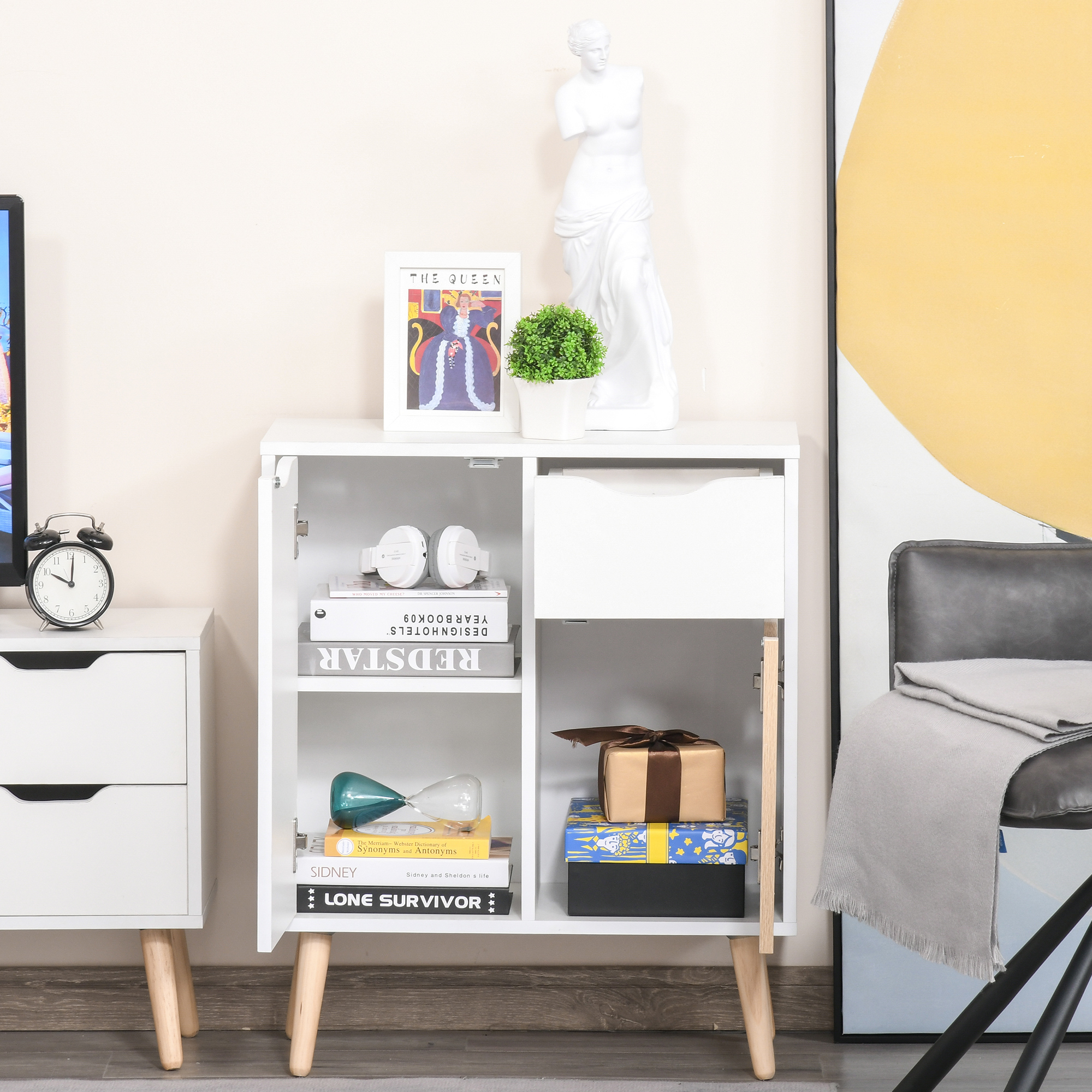 Keep your home stylish and the space tidy: look no further than this freestanding cabinet from HOMCOM. Cut to a clean boxy shape for simplicity, it comes with two cupboards and a top drawer, giving a moderate amount of storage. The white finish is clean, with the coloured door adding a unique point of difference so it stands out gently. Made from particle board, this piece is durable, finished with small wooden legs so it stands steady and back straps so it doesn't topple over.