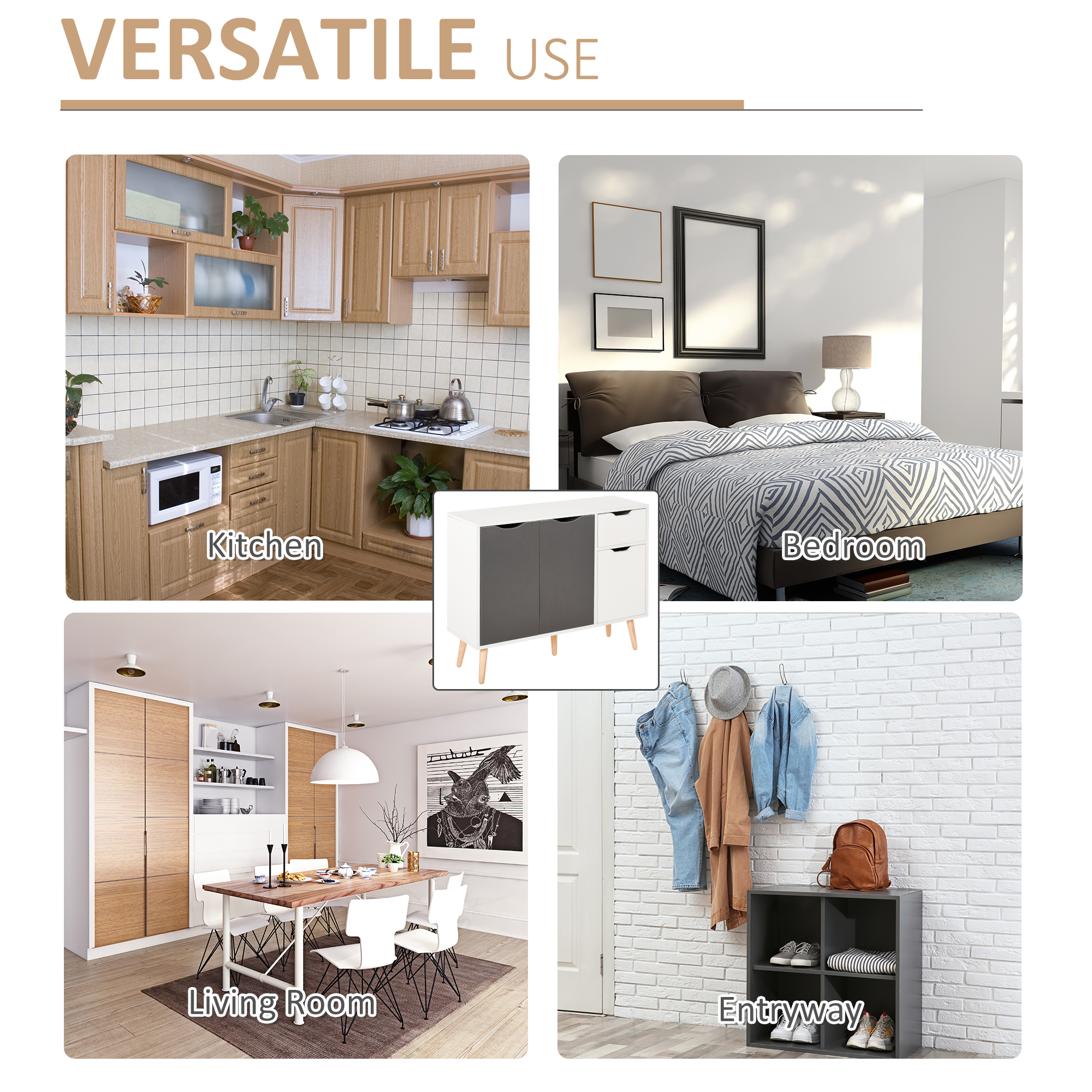 Keep your home stylish and the space tidy: look no further than this freestanding cabinet from HOMCOM. Cut to a clean boxy shape for simplicity, it comes with two large cupboards, a smaller cupboard and a top drawer, giving an abundance of handy storage. The white frame is clean, with the mix of white doors and coloured doors adding a unique point of difference so it stands out. Made from particle board, this piece is durable, finished with five wooden legs so it stands steady and back straps.