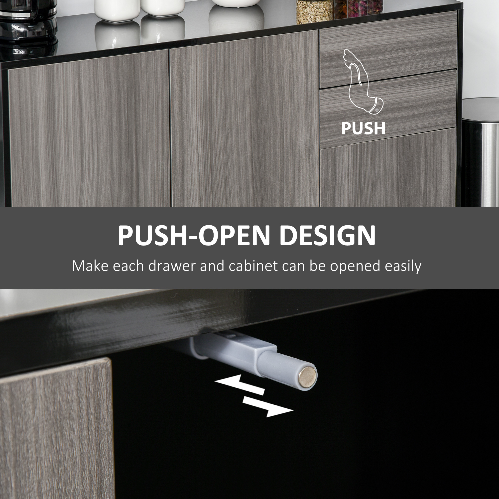 This small sideboard from HOMCOM is a durable and stylish addition to every home, keeping your space clean and tidy with ease. It's made from particle board for a durable structure, with anti-tipping straps on the back for safety. With the push-click design, drawers and cabinet doors are quick and effortless to open and close. The elevated base allows air to flow through for freshness. An effortless way to bring in sleek style into your living space with our HOMCOM storage cupboard.