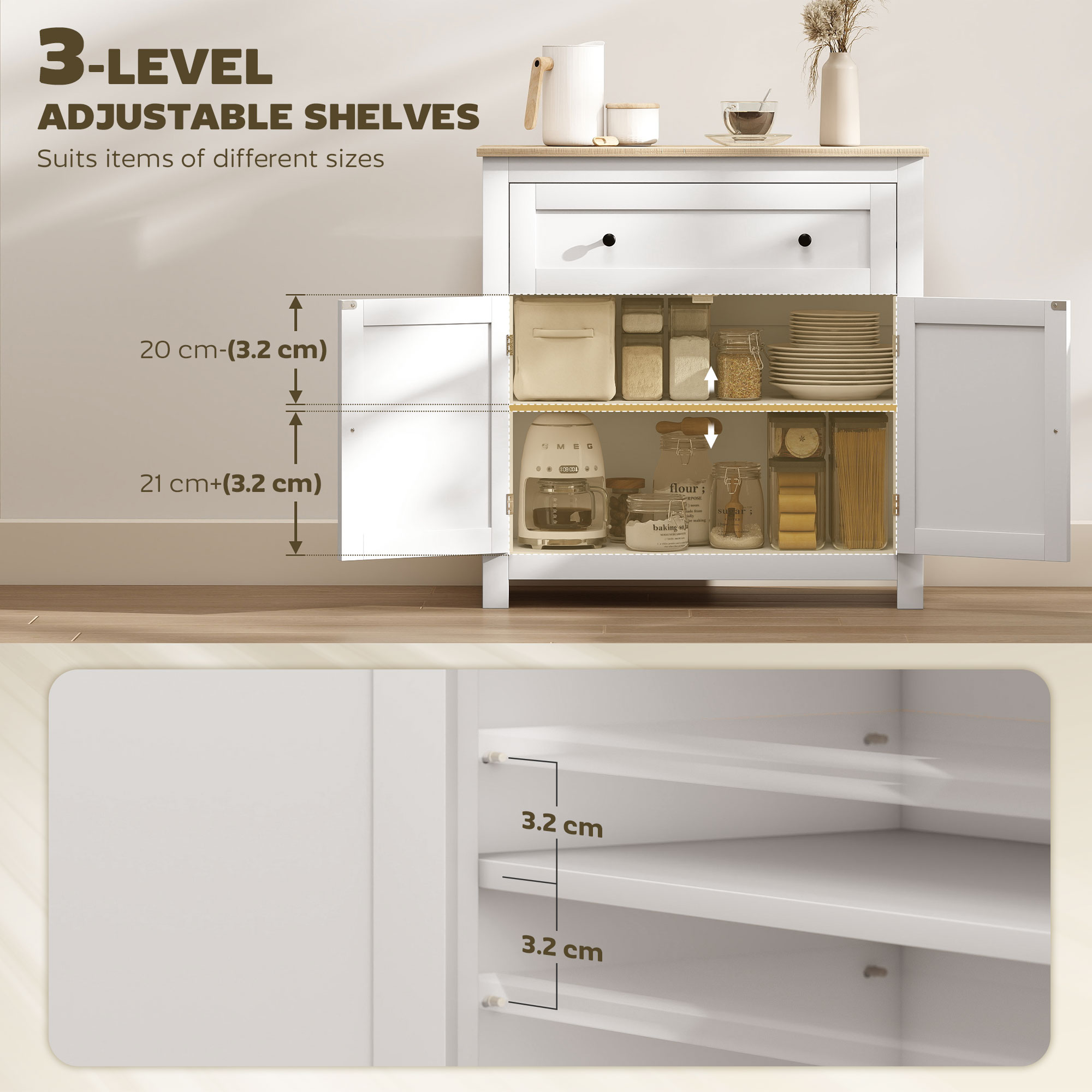 Imagine a clutter-free home with the HOMCOM sideboard storage cabinet. Struggling with disorganized spaces? This living room sideboard offers a large drawer and a double-door cabinet equipped with an adjustable shelf to neatly store dishes, wine, or gadgets. Its modern oak grain top and sleek design enhance any room, while its versatile size fits kitchens, dining rooms and bathrooms, elevating your daily routines and family gatherings.