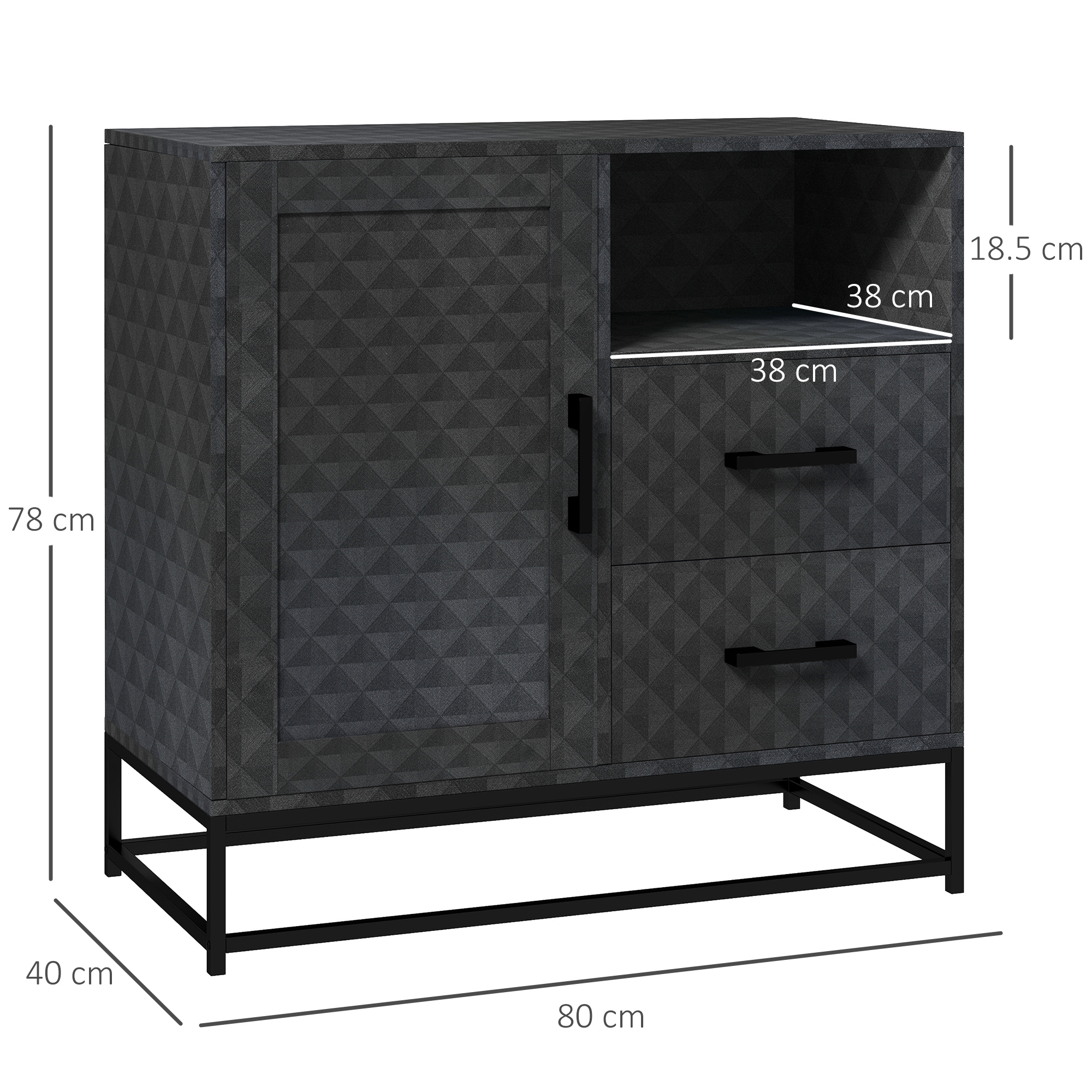 Discover the charm and functionality of the HOMCOM sideboard. This versatile piece features a storage cupboard with an adjustable shelf, an open compartment and two drawers, ensuring that every item is stored neatly and within easy reach. It' s a stylish and practical solution for any home, ensuring everything has its place while adding a touch of elegance to your decor.