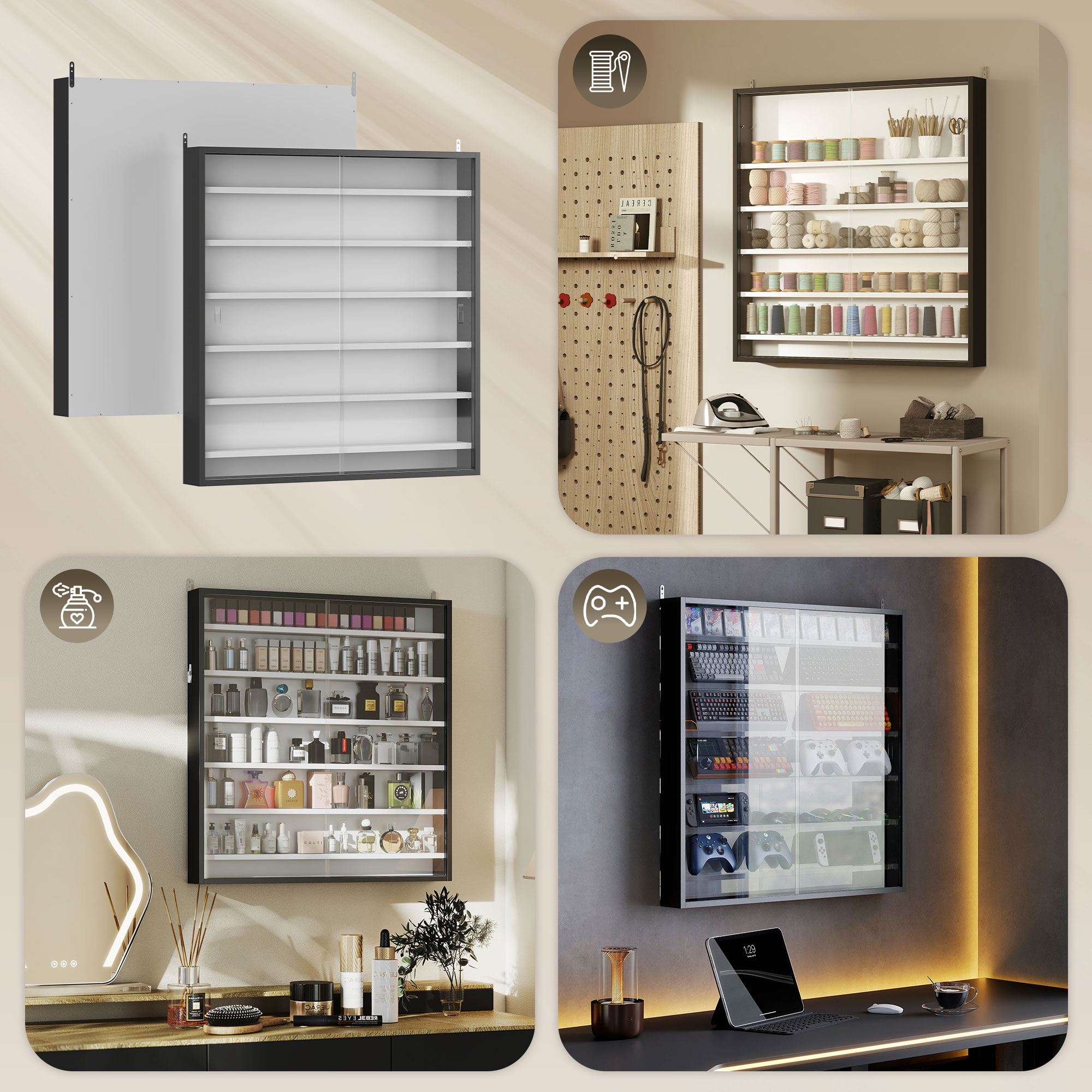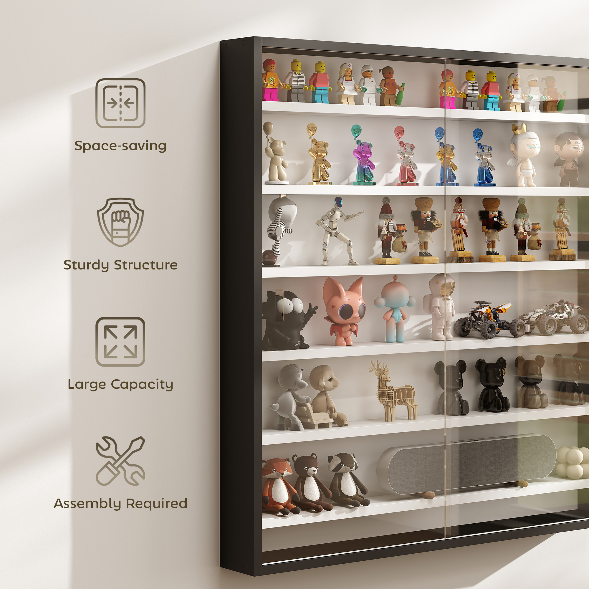 Display and organise favourite decorations with this HOMCOM wall display cabinet. It has six adjustable shelves, with 11 different positions, offering lots of space for smaller and larger items. Made from particle board, the structure is sturdy, and fitted with two sliding glass doors, keeping everything protected and allowing easy access. Easy to fix onto walls, this classic home furnishing will keep all your favourite pieces beautifully displayed.