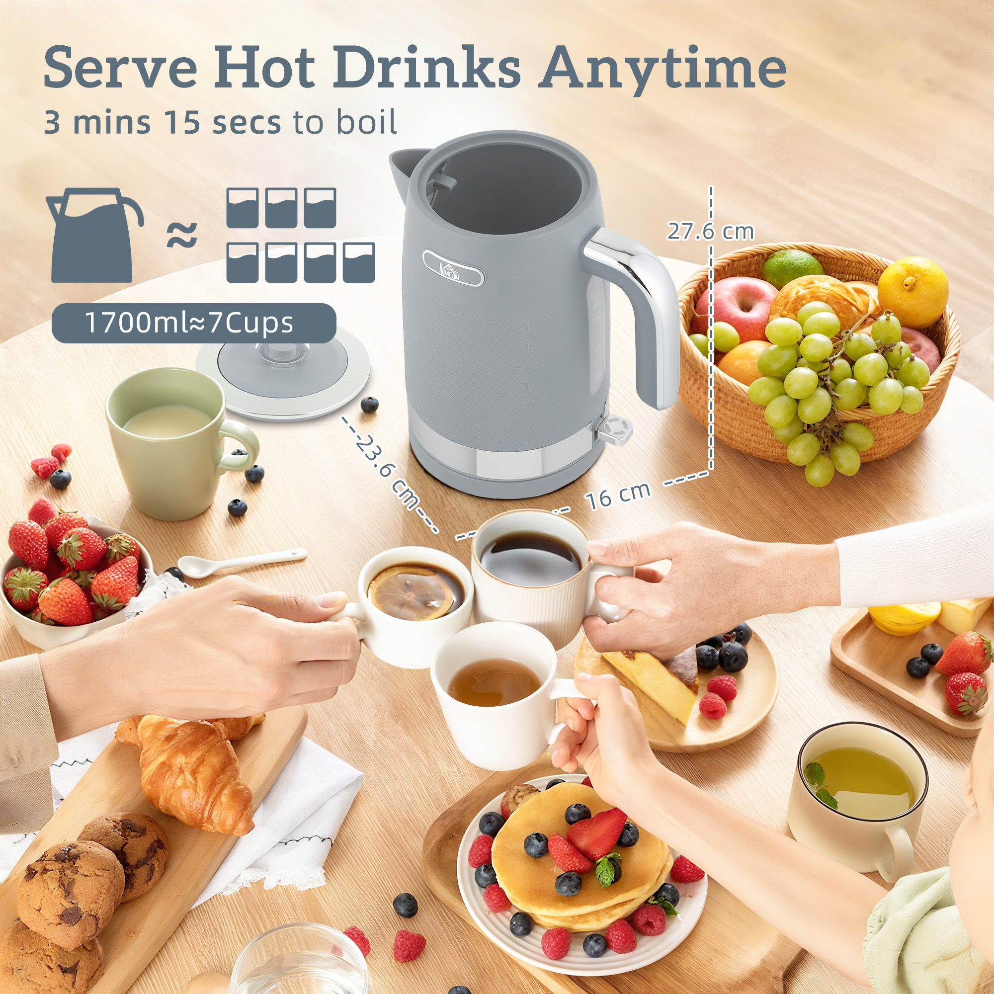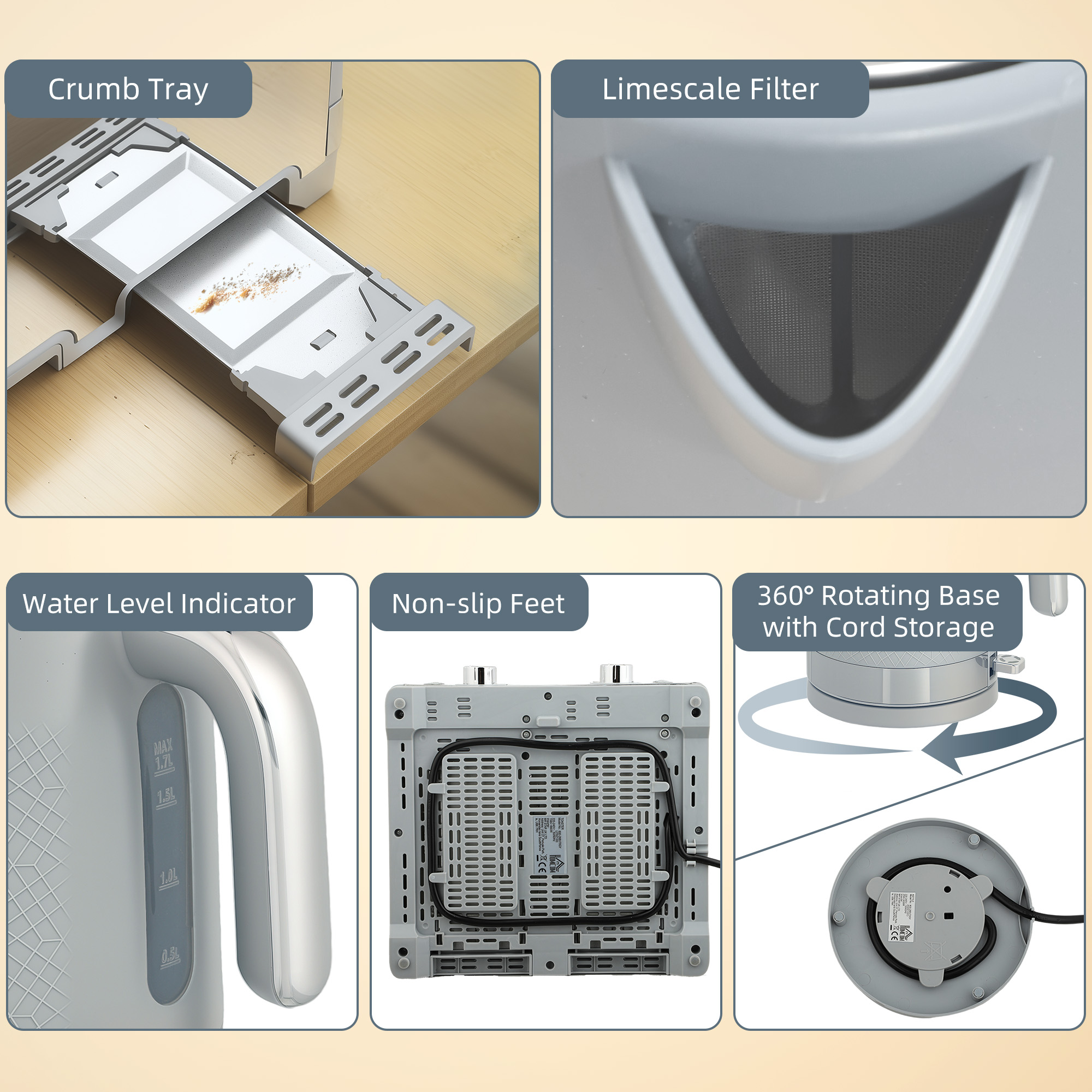 Super sleek, with a touch of texture: welcome this HOMCOM kettle and toaster set onto countertops. Both pieces blend a curved shape, with polished metal accents and in a matte colour finish with a touch of texture - a distinctive set for your kitchen. Fitted with an Otter thermostat, the 1.7L kettle boils water within minutes, so everyone can enjoy a hot drink quickly. The wide slot four-slice toaster has seven browning levels to enjoy just how you like it.