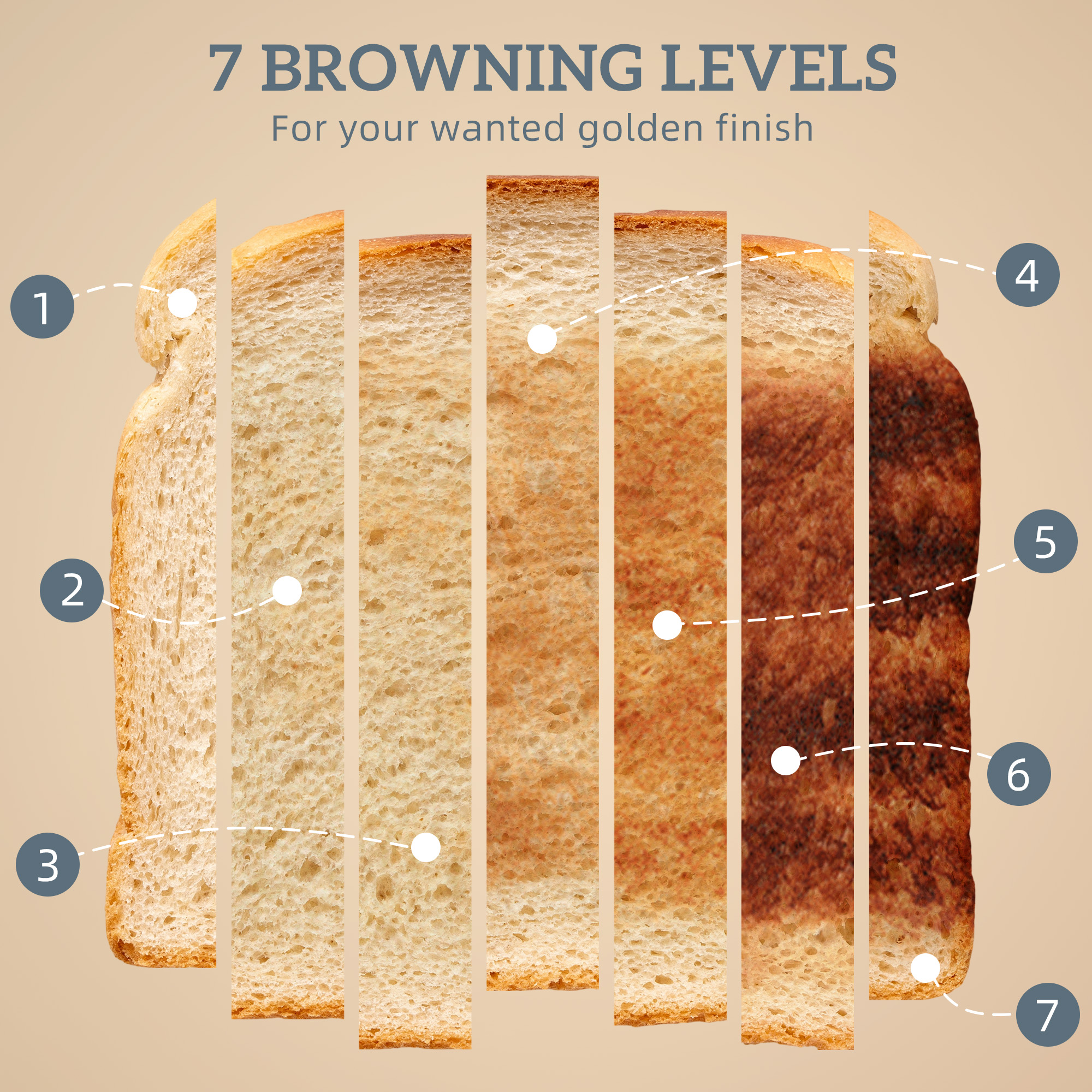 - Two-slice toaster has seven browning levels, with defrost, reheat and cancel function