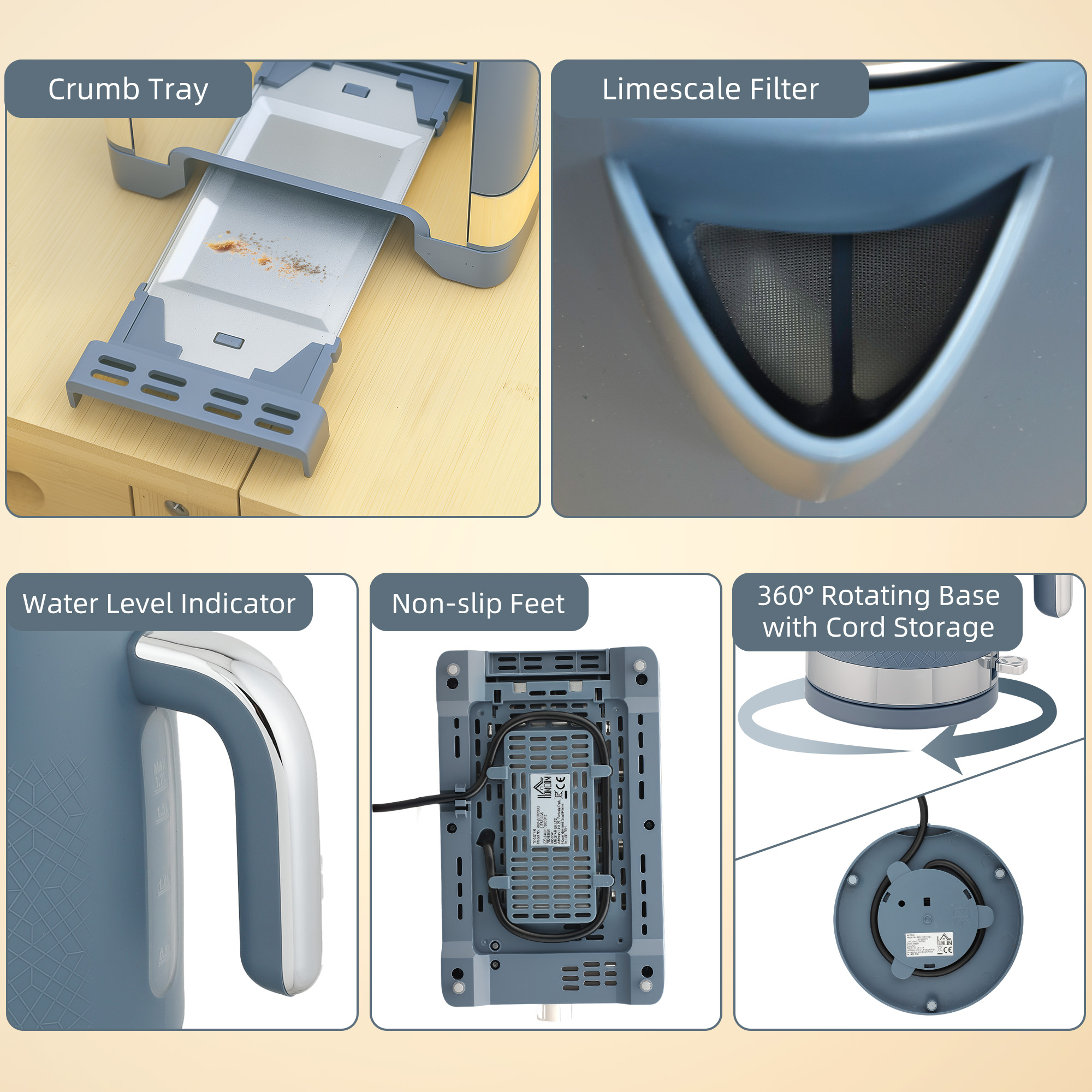 Super sleek, with a touch of texture: welcome this HOMCOM kettle and toaster set onto countertops. Both pieces blend a curved shape, with polished metal accents and in a matte colour finish with a touch of texture - a distinctive set for your kitchen. Fitted with an Otter thermostat, the 1.7L kettle boils water within minutes, so everyone can enjoy a hot drink quickly. The wide slot two-slice toaster has seven browning levels to enjoy just how you like it.
