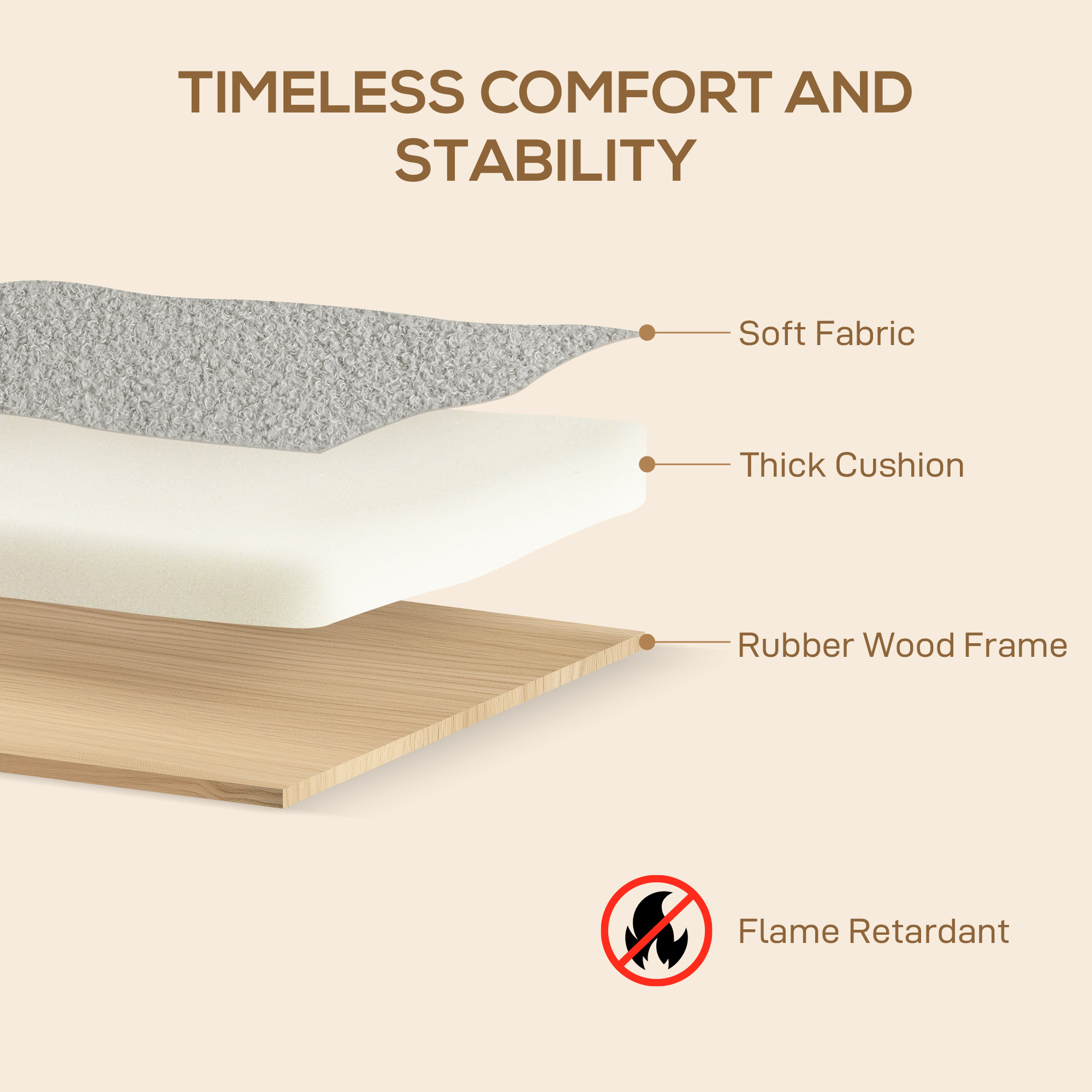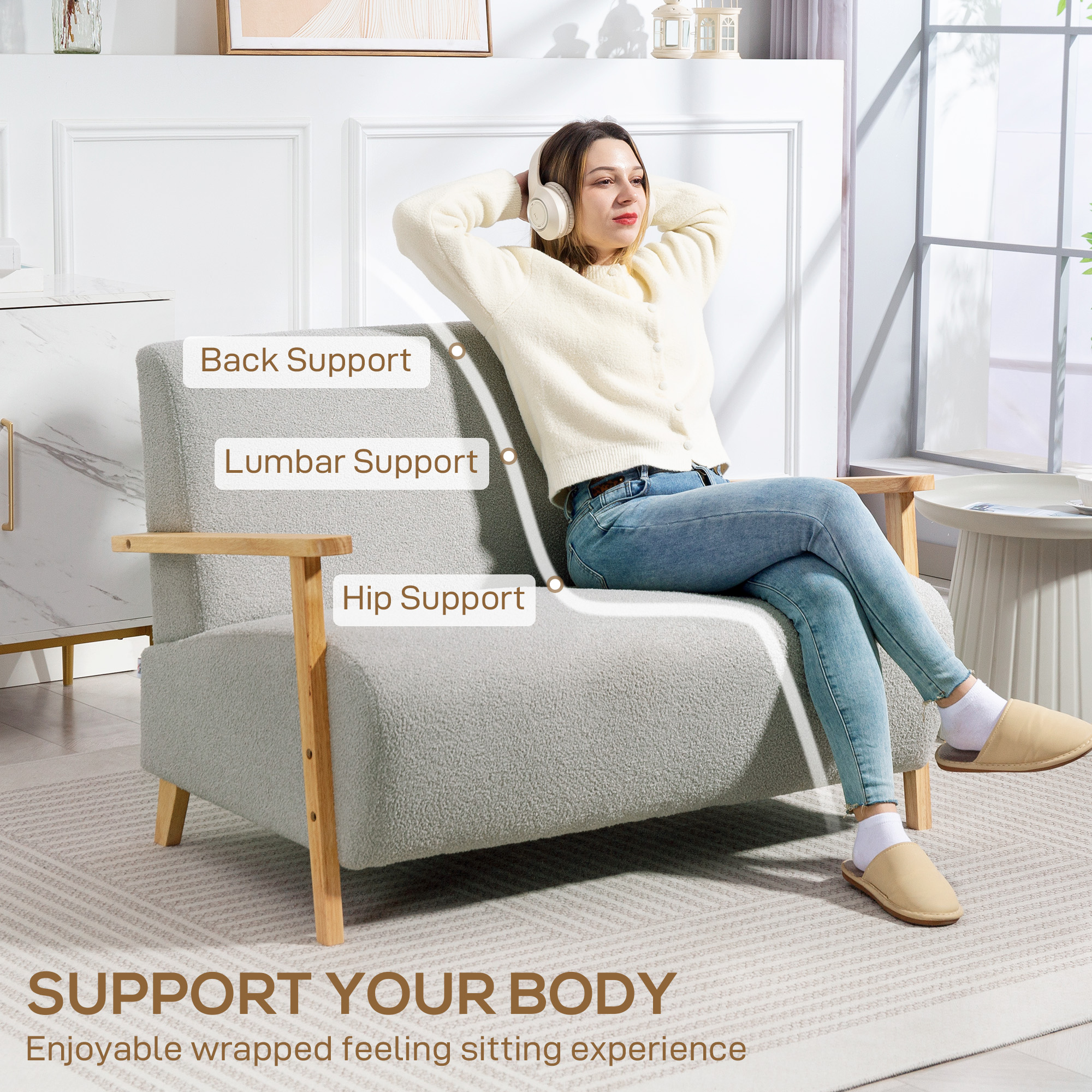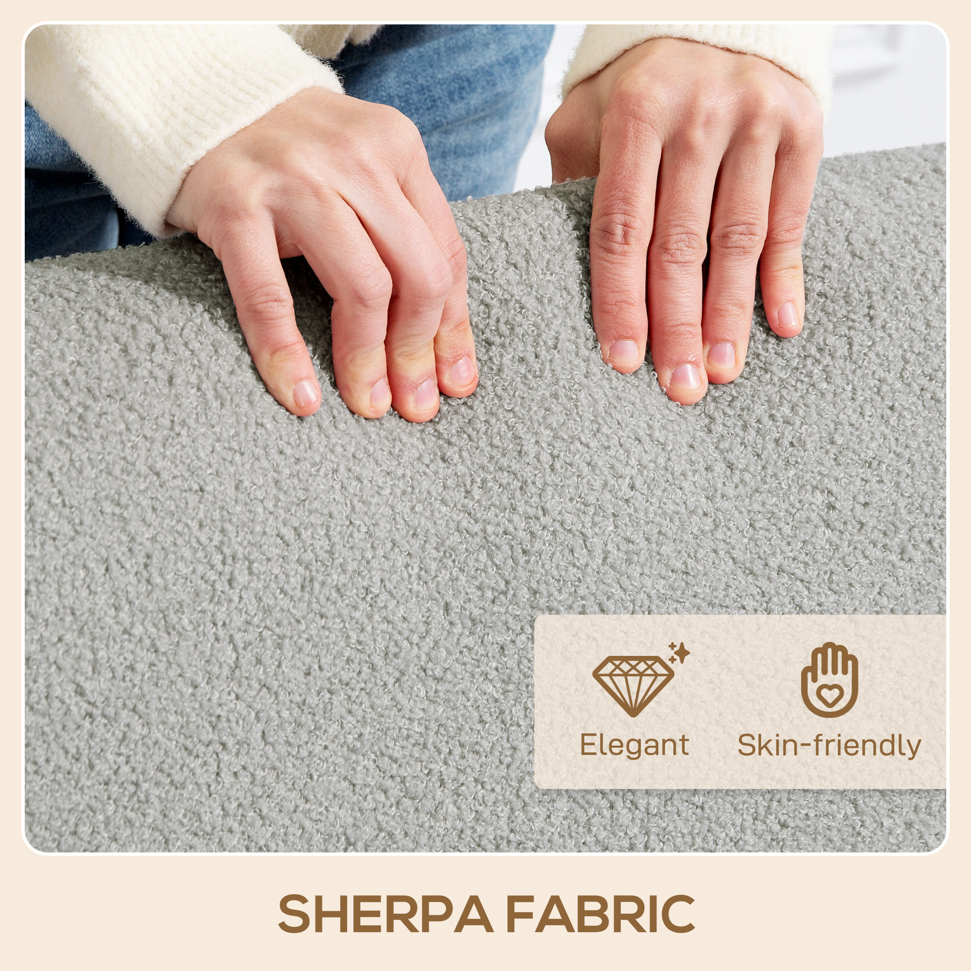- Sherpa fabric cover offers a plush, cosy feel. Rubber wood armrests and legs add a touch of elegance