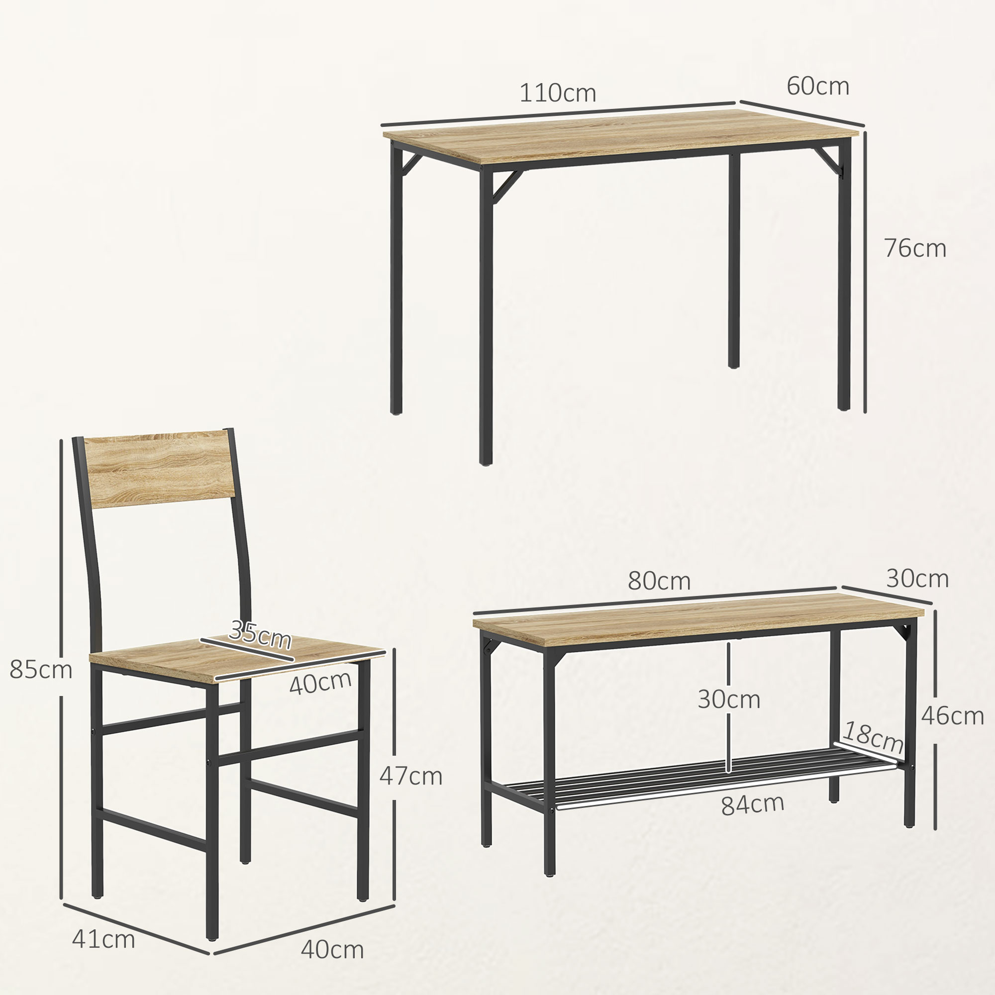 A forever-stylish focal point for family dinners and more with this HOMCOM dining table set. Powder coated steel frames for strong cores, fitted with durable particle board tops. The wood-effect is classic and looks greats in a wealth of home interiors. The dining room set comes with a rectangular dining table, two-seater bench and two chairs. Complete with a small shelf underneath the bench seat.
