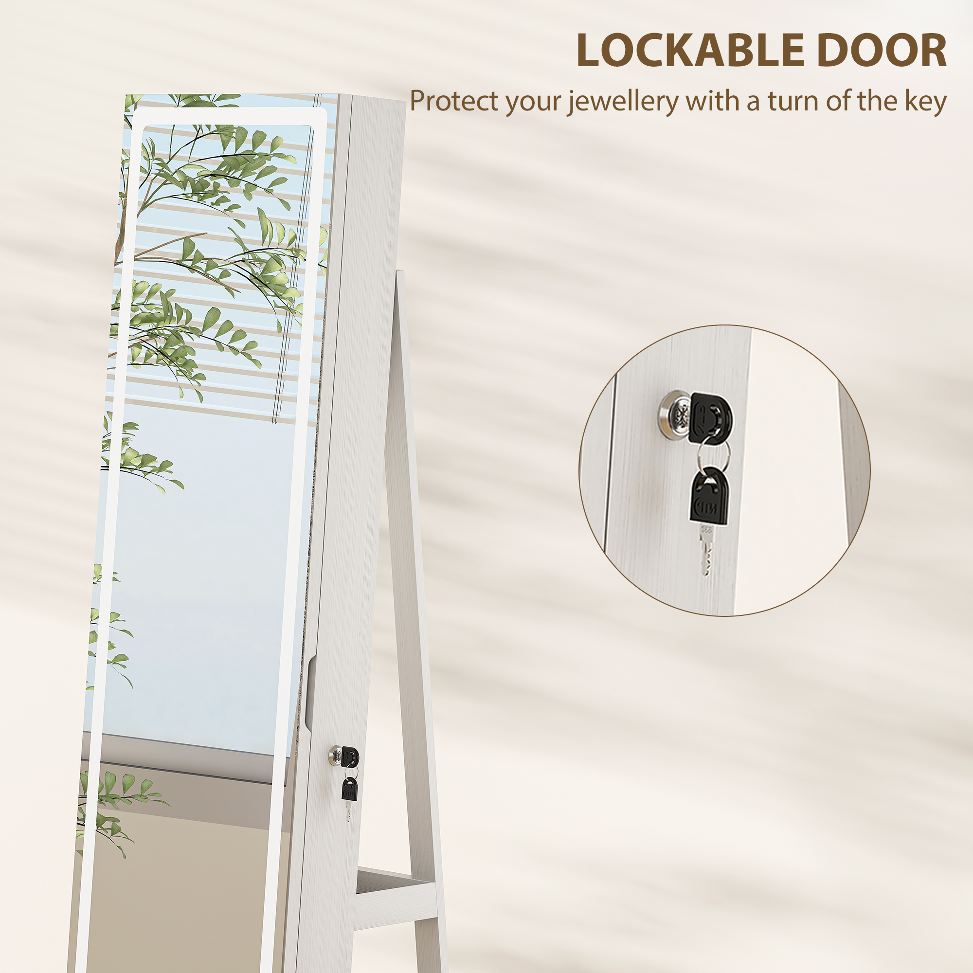 A place to get ready, and keep all the cosmetics and essentials in one place. Bring this HOMCOM jewellery cabinet into your bedroom and beyond. Open the door to reveal 78x ring slots, 108x earring slots, 36x necklace hooks, a bracelet rod, a storage bag and four shelves, with three outer back shelves. On the front there's a longline mirror, with three-colour LEDs so you can ready any time of the day. Complete with a side hook and magnetic closure to keep the door closed at all times.