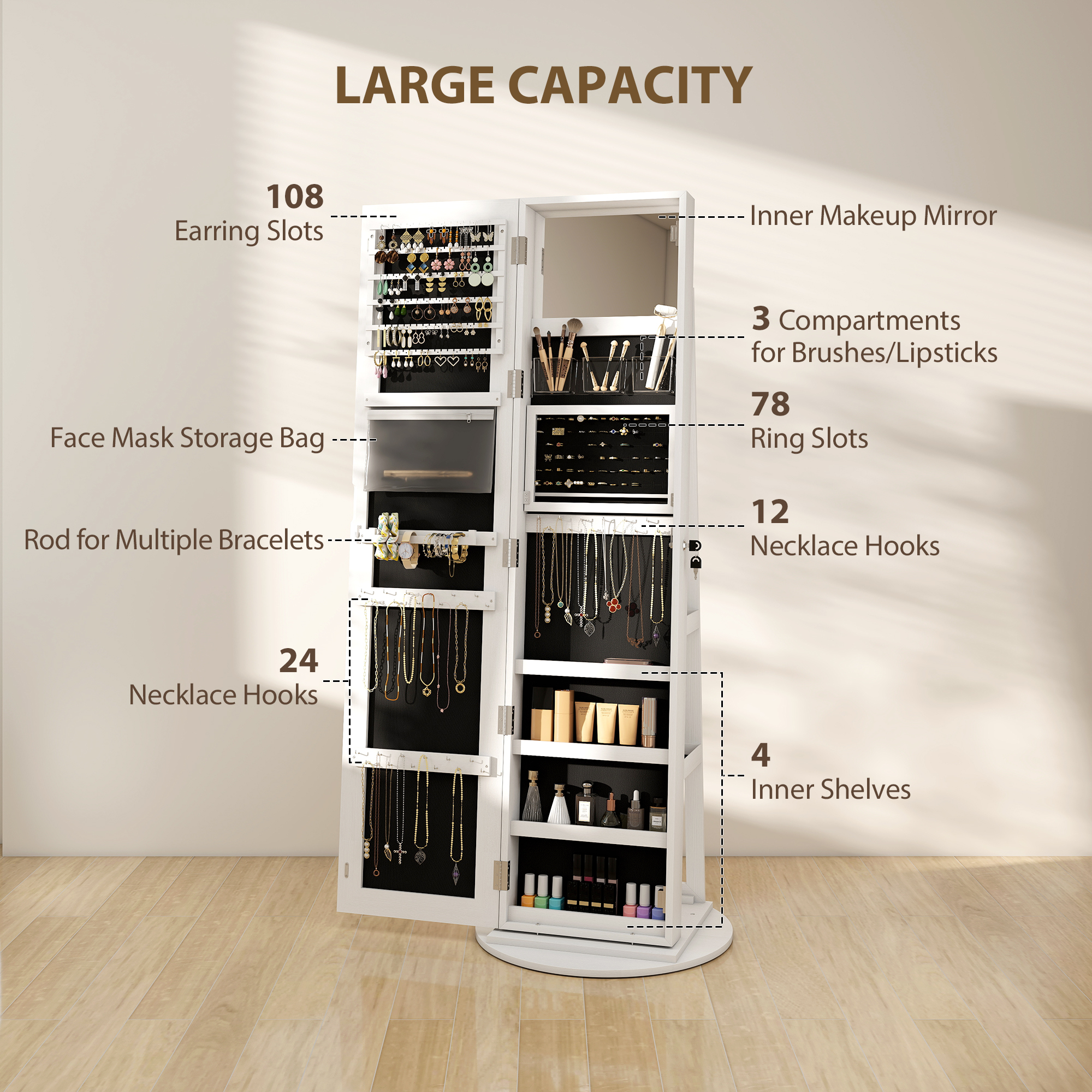 - Inner storage: 78x ring slots, 108x earring slots, 36x necklace hooks, a bracelet rod, a storage bag and four shelves, with three outer back shelves