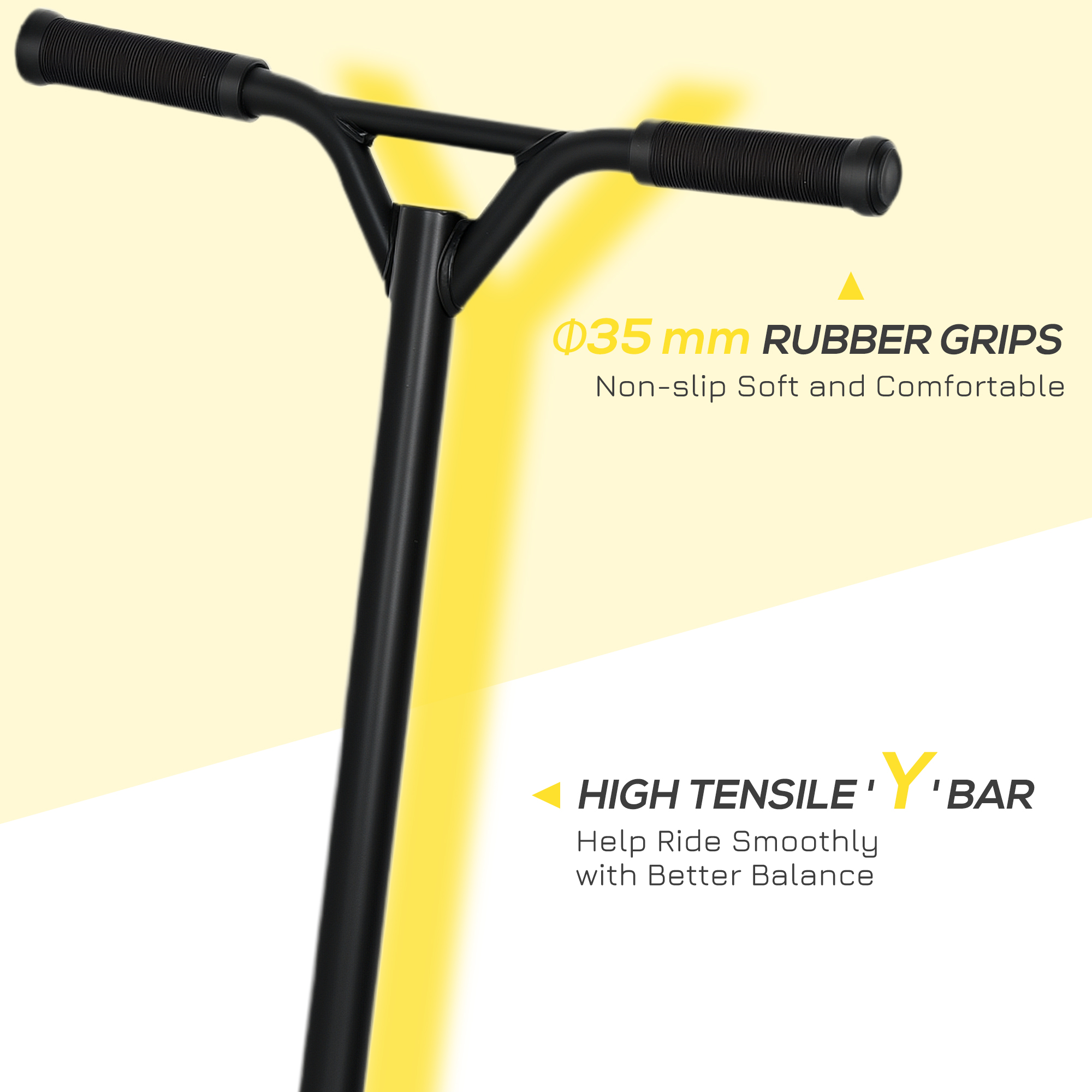 Practice your tricks and stunts with HOMCOM stunt scooters. It has rotating handlebars and front wheels, so you'll learn a new range of scootering skills, whilst the wide non-slip deck keeps you balanced when performing stunts – the rear brake brings you to a swift stop at any time. Made from durable steel and aluminium, its lightweight frame is easy to carry and makes riding much smoother, especially with the PU wheels – the non-slip handlebars are comfortable to hold when riding.