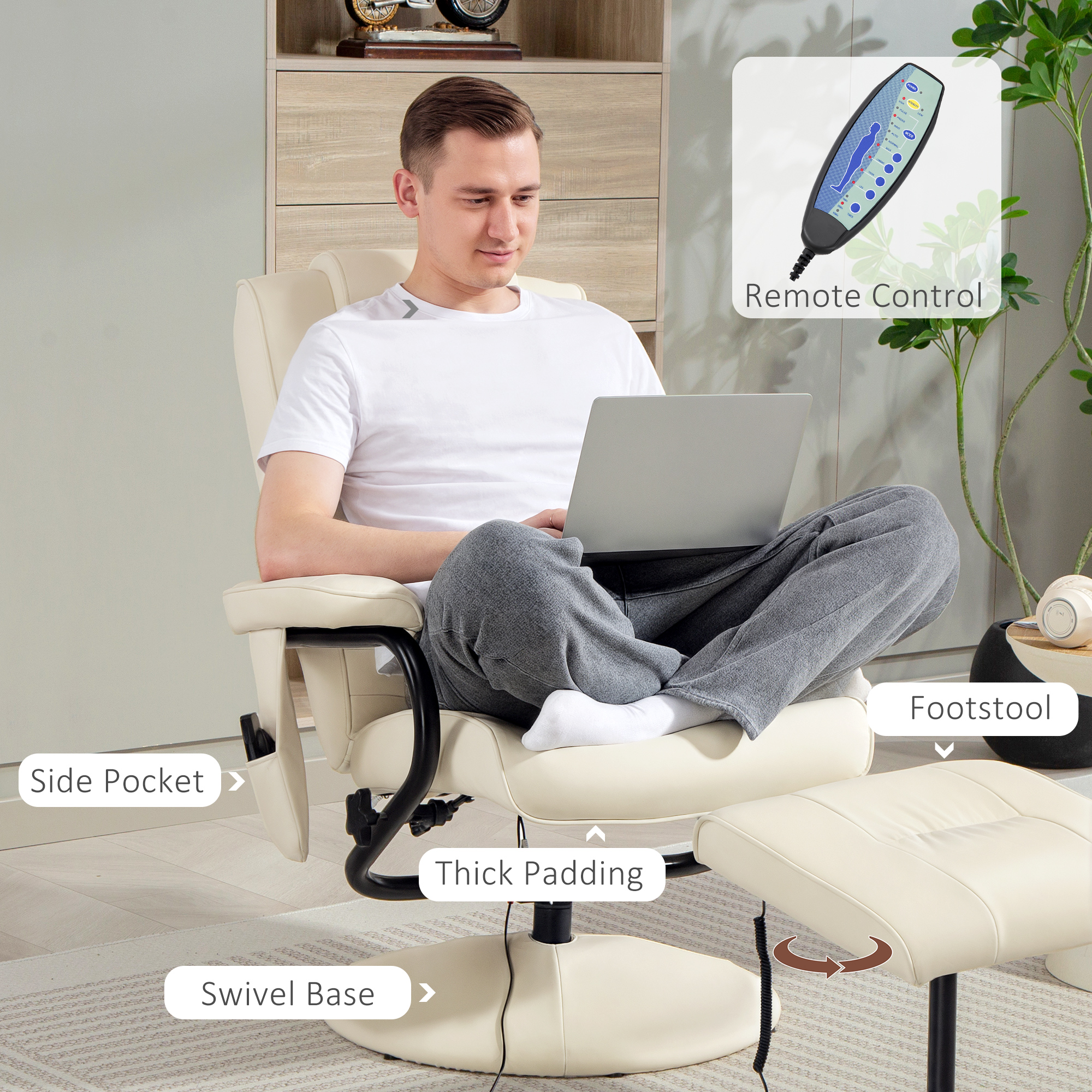 After a long day, you need a relaxing chair to relax and melt the aches and pains away. This HOMCOM recliner massage chair set does just that. It comes with a chair and footstool, so you have everything you need to put your feet up - both are padded for comfort, with PU leather upholstery for a sleek look. The chair reclines back to a maximum 145° angle, with 10 vibrating points (controlled by the included remote) to give you the full experience with sitting, lying and 360° rotating.
