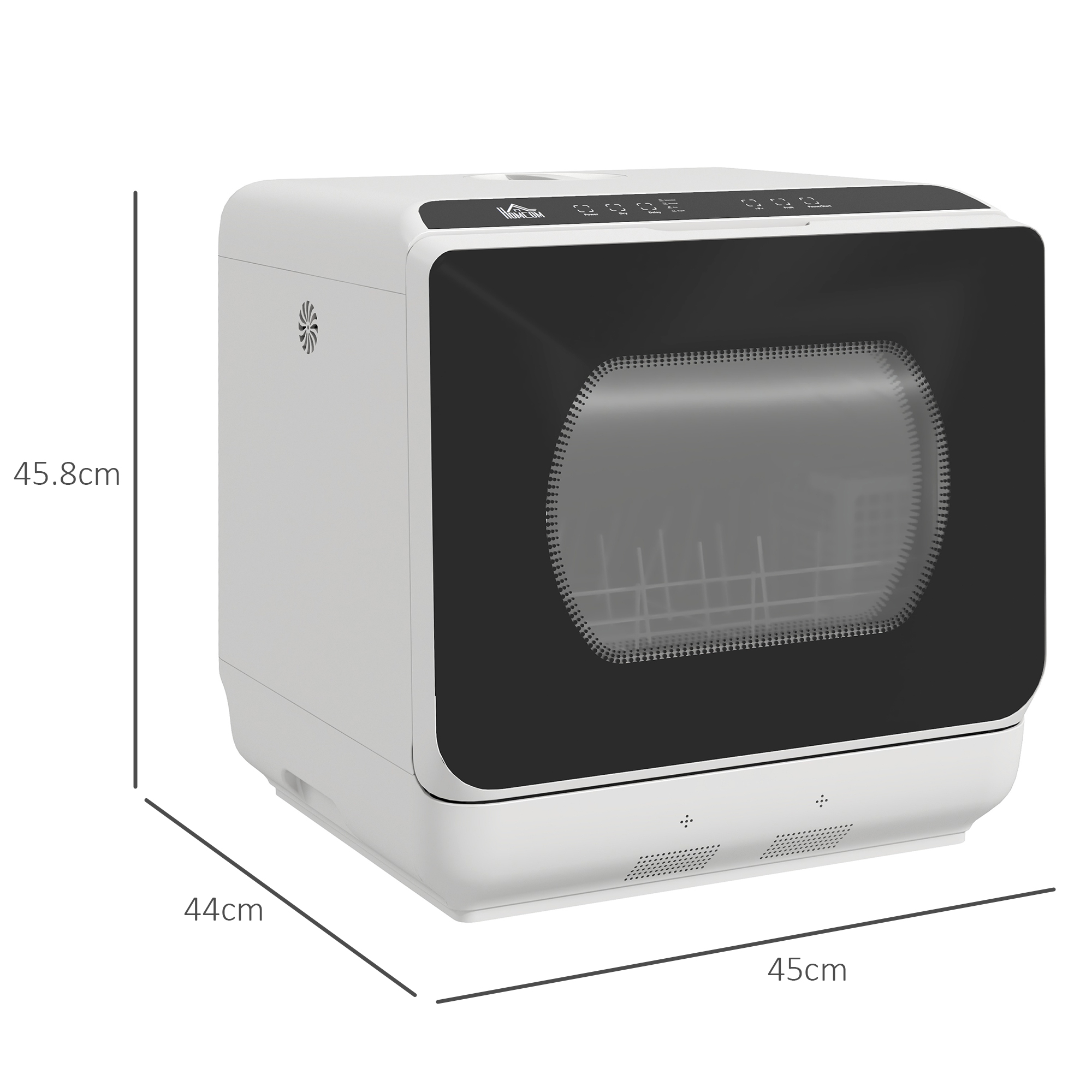 Say goodbye to the hassle of manual dishwashing, anywhere, with this HOMCOM tabletop dishwasher! It has six programmes: intensive, efficient, normal, rapid, fruit wash and drying. The efficient spray arm ensures sparkling clean dishes every time. A compact dishwasher, suitable for four-person households.