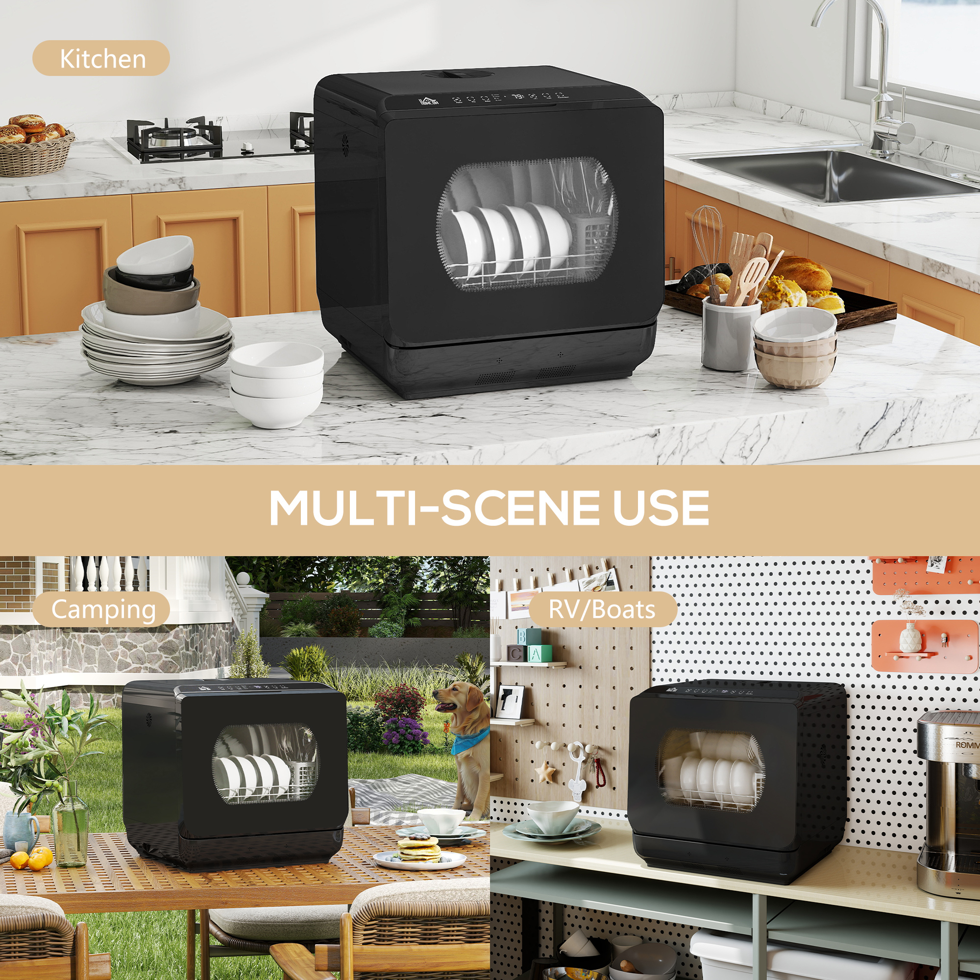 Say goodbye to the hassle of manual dishwashing, anywhere, with this HOMCOM tabletop dishwasher! It has six programmes: intensive, efficient, normal, rapid, fruit wash and drying. The efficient spray arm ensures sparkling clean dishes every time. A compact dishwasher, suitable for four-person households.