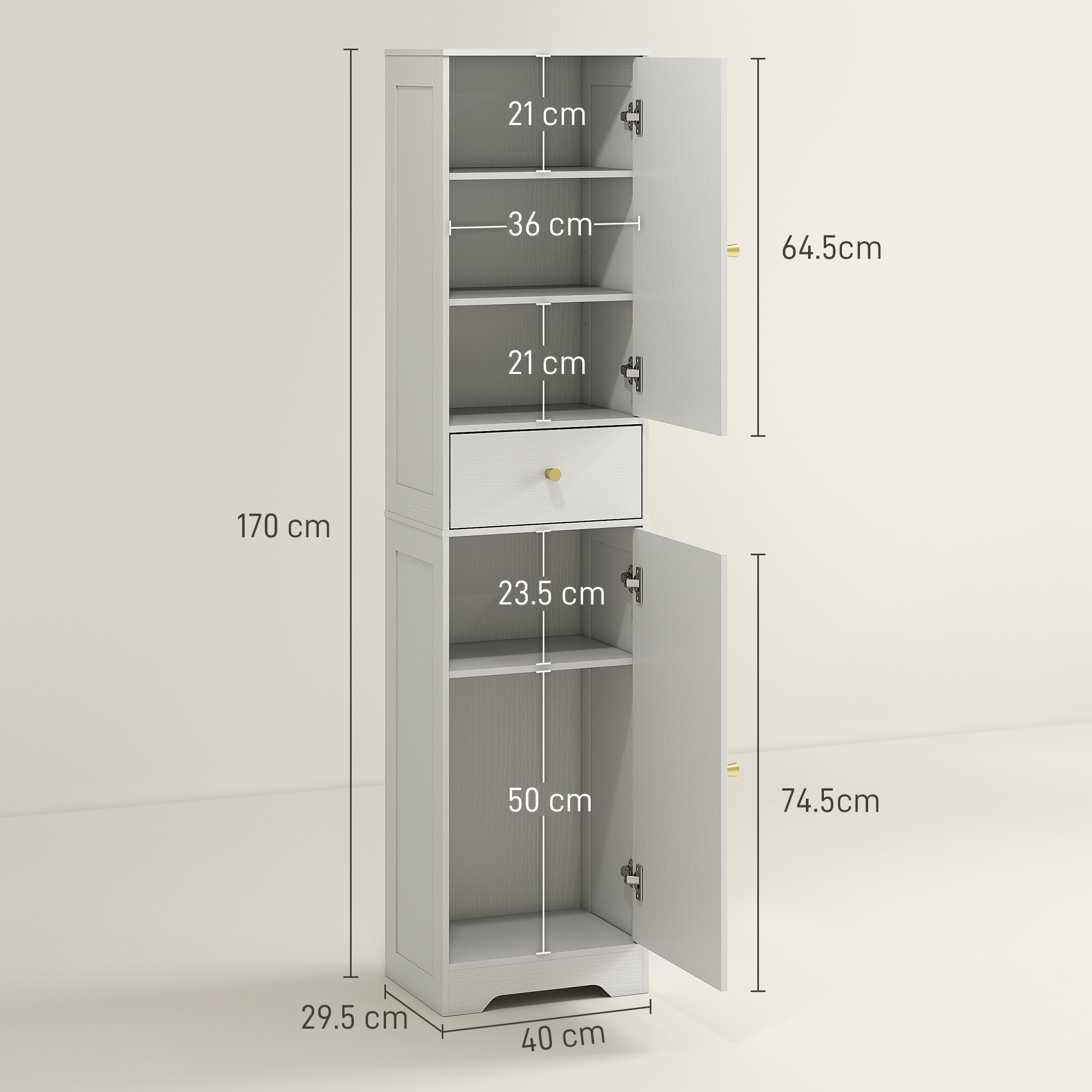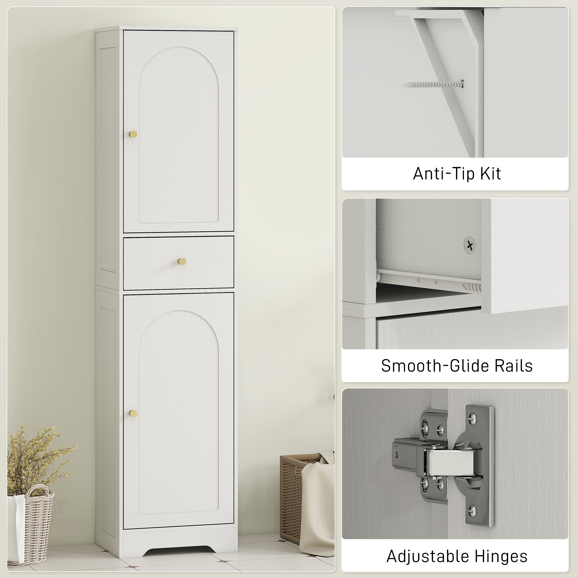 Bring calm and order to your bathroom with this tall yet slim cabinet. Two single-door cupboards and a middle drawer keep toiletries, towels and daily essentials neatly tucked away, while a three-level adjustable shelf in the top cupboard adapts to your needs. With its elegant embossed finish, arched doors and gold-tone knobs, the slim bathroom storage unit blends style with practicality. A great fit for compact bathrooms—safe, stable and full of charm.