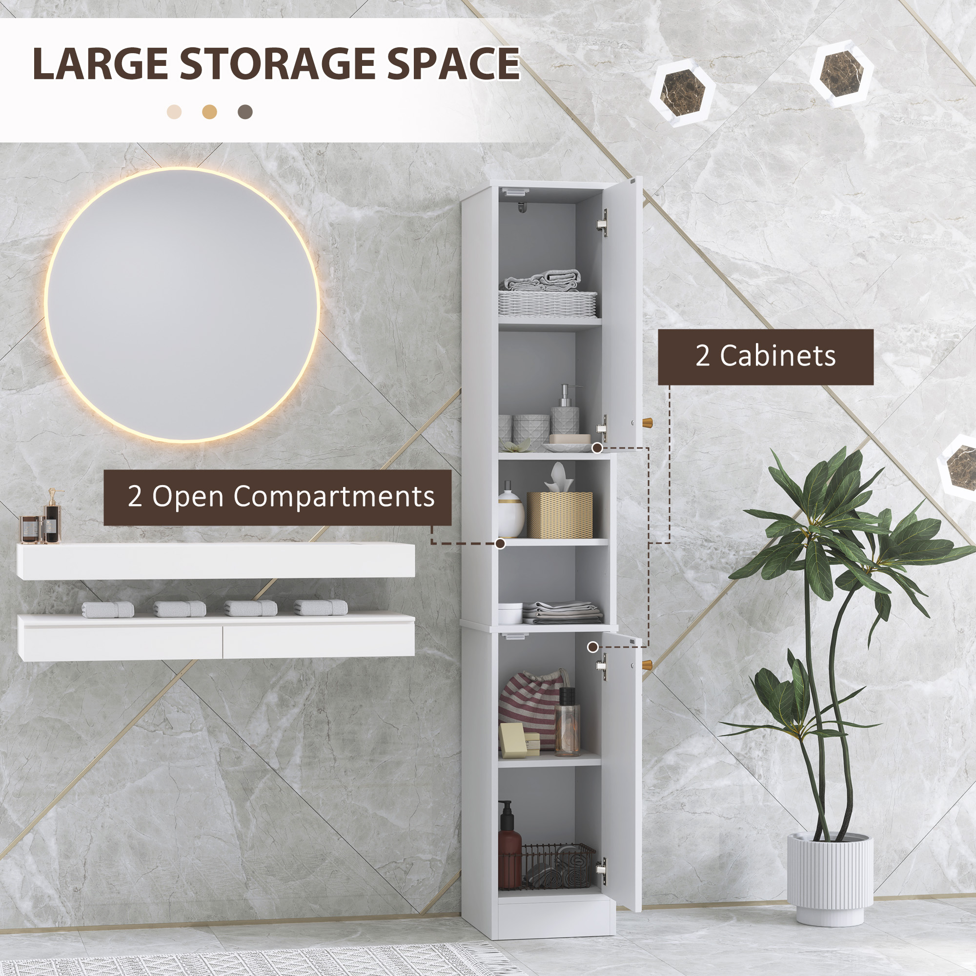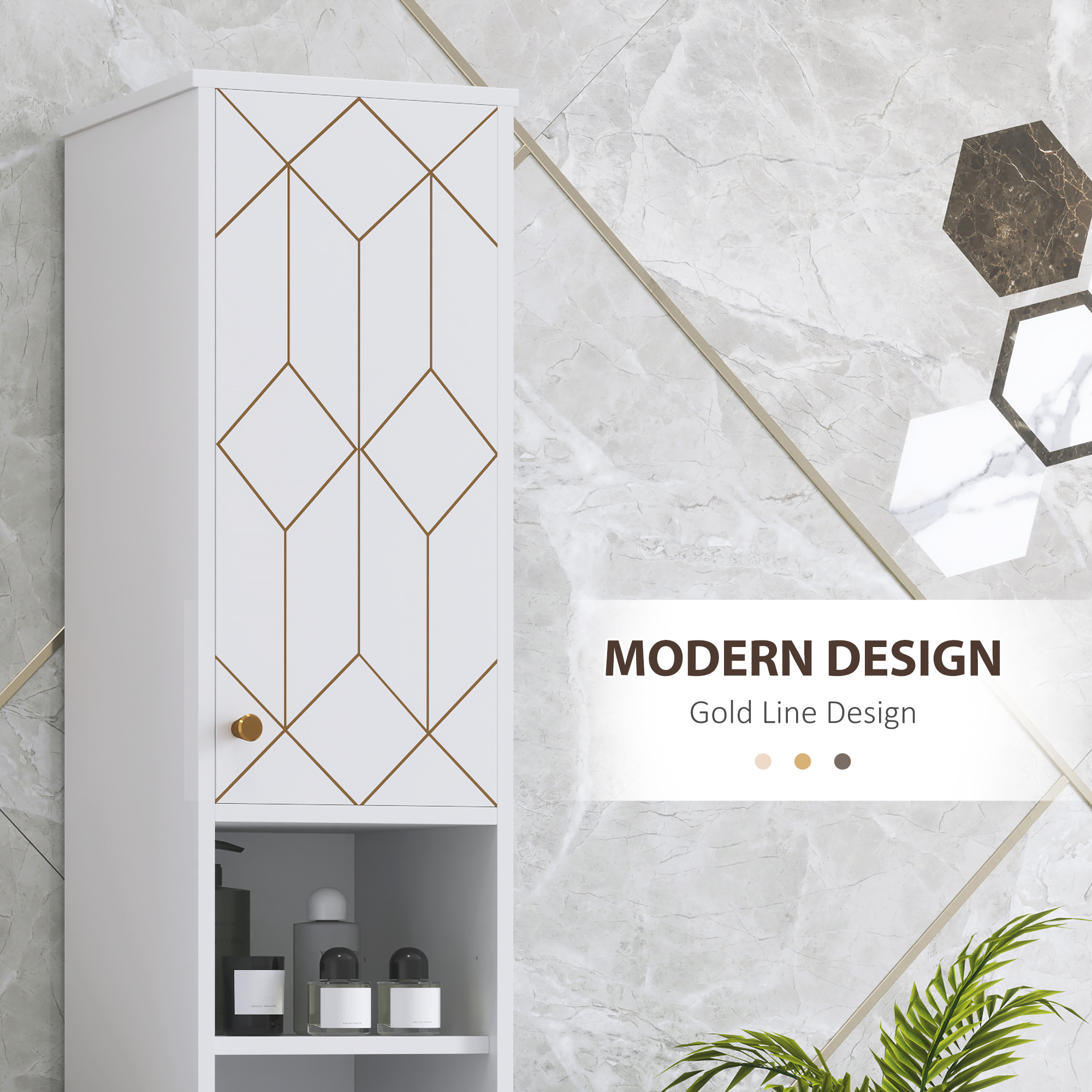 Maximise your bathroom's charm and storage with HOMCOM's tall bathroom cabinet. Featuring two two-tier cabinets and open compartments, adjust your storage space with three-level shelves to suit your needs. The modern design boasts gold tone geometric elements and chic round handles, blending functionality with style in any bathroom setting. An anti-tipping design ensures safety and stability.