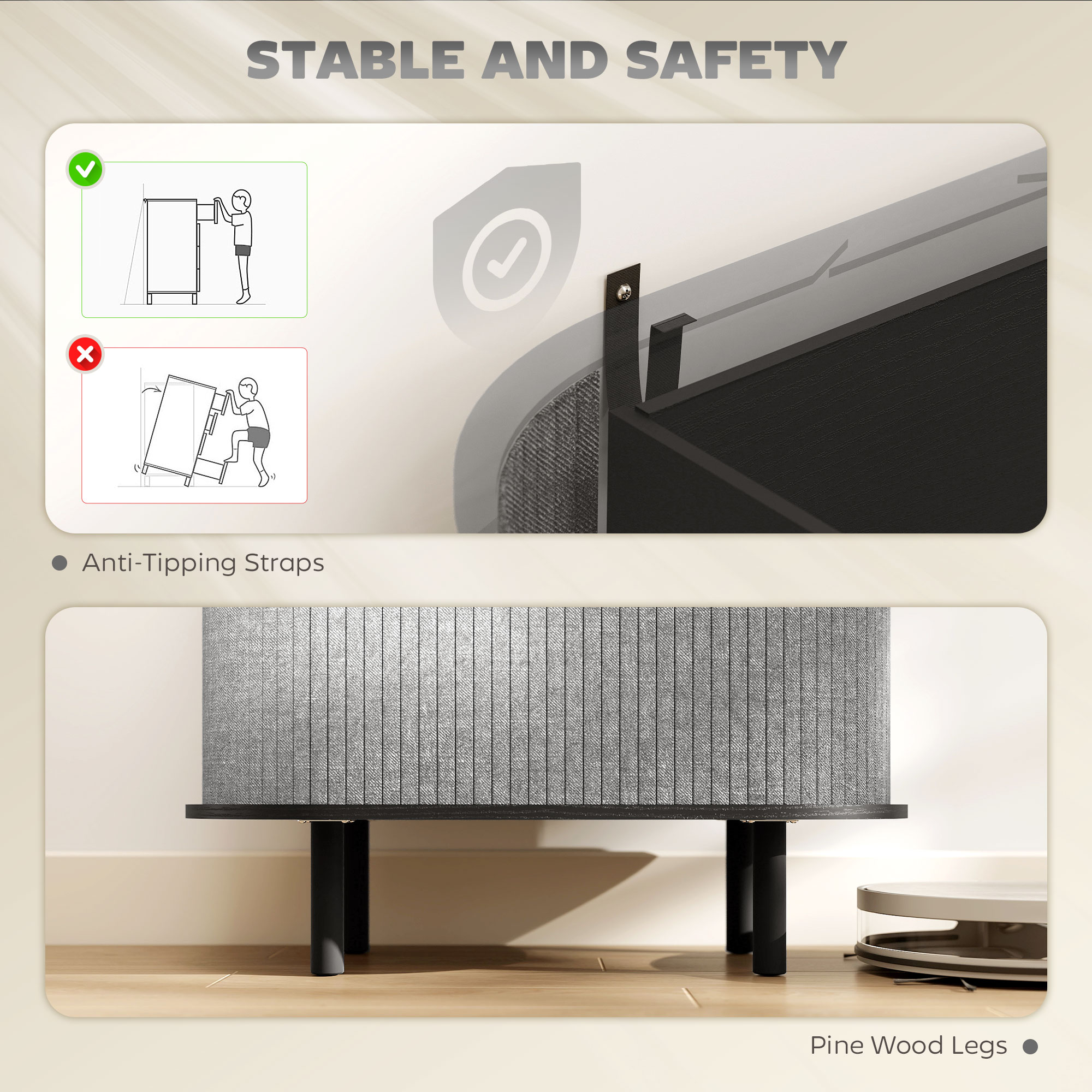 - Four pine wood legs and anti-tipping straps ensure stability and safety