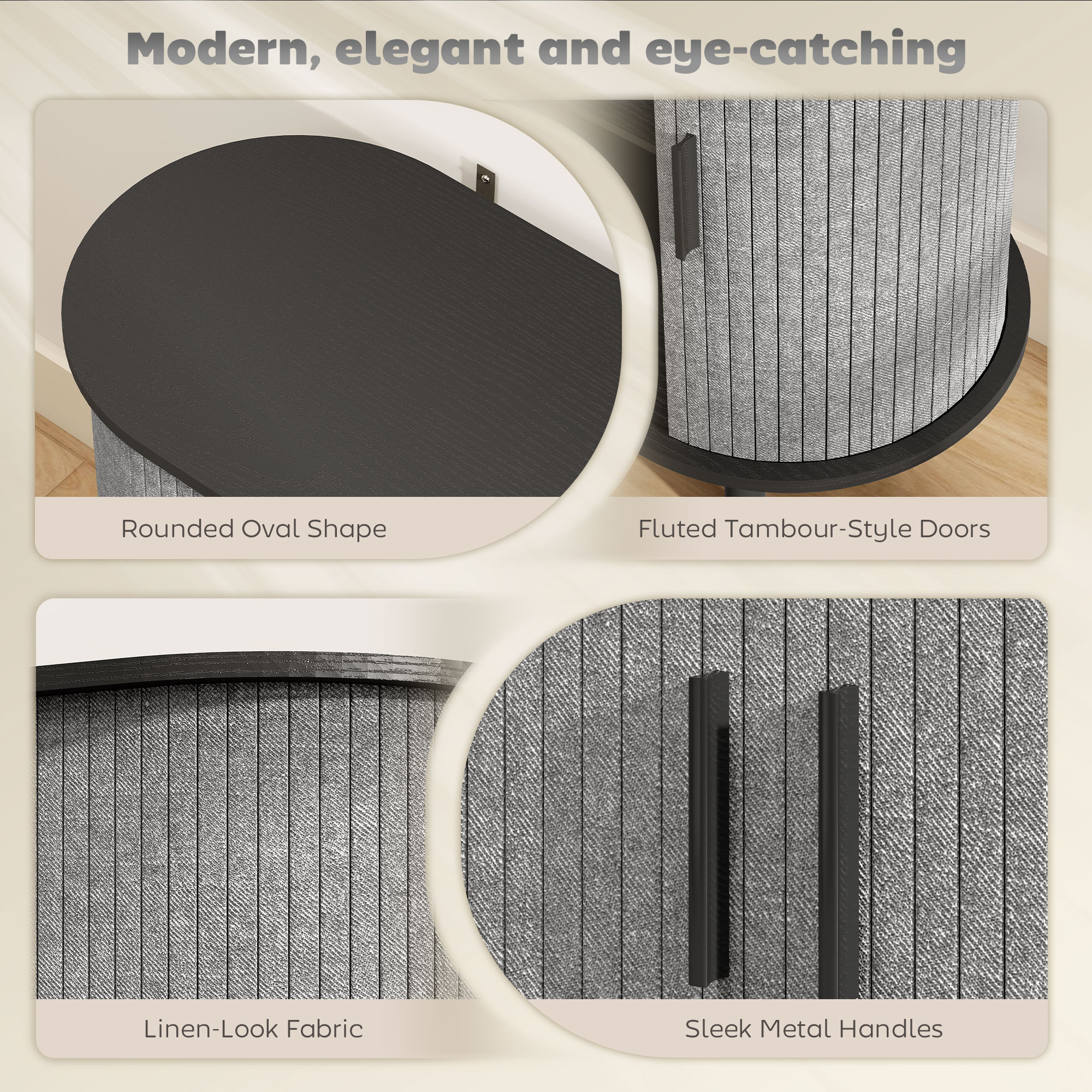 Looking for a beautiful way to display your favourite decorations? This oval sideboard from HOMCOM does more than store—it showcases. With smooth curves and fluted tambour-style doors covered with linen-look fabric, the buffet cabinet brings subtle texture and warmth to any space. Slide open the doors to hide clutter and keep the top clear for candles, vases, or framed photos. Great for elevating your living room, hallway, or dining area.