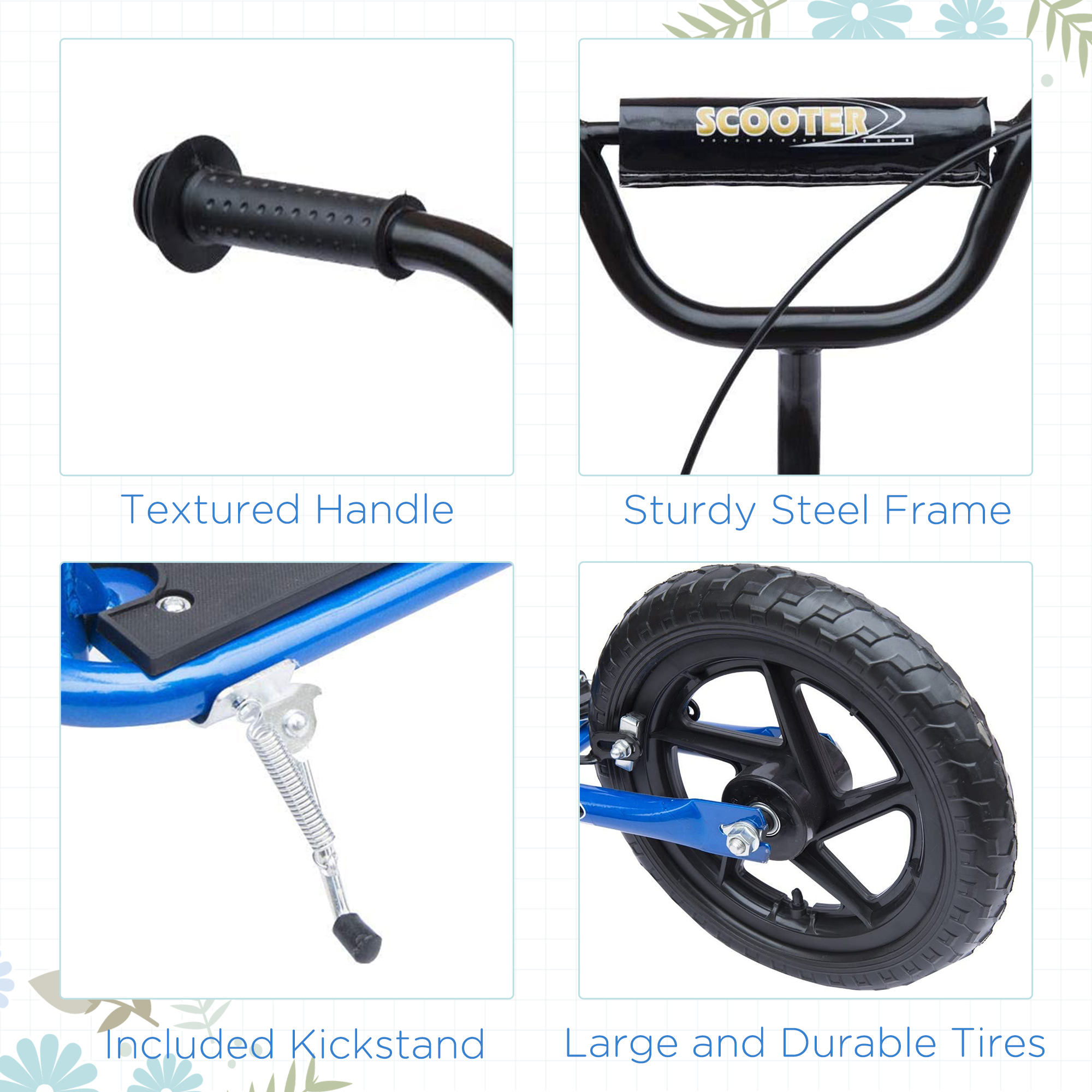 An outdoor classic, this HOMCOM kids scooter delivers fun and excitement with every ride. Suitable for ages 5-12, the adjustable handlebars grow with your child for long-term use. Its solid steel frame, wide non-slip foot deck and responsive rear brake keep rides safe and steady. With smooth-rolling 12" wheels, it's great for school runs, park adventures or just cruising the street – wherever they go, the fun follows.