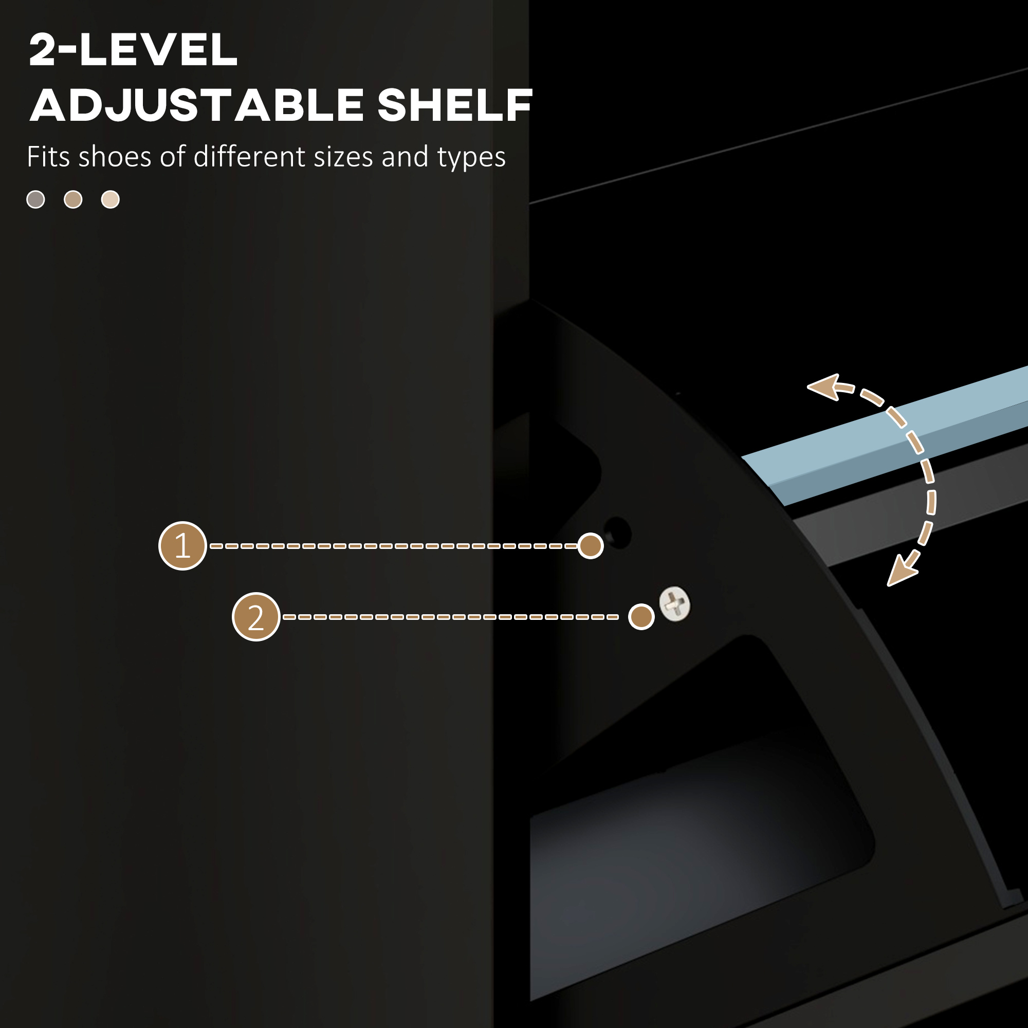 - Two-level adjustable inner shelves for different footwear