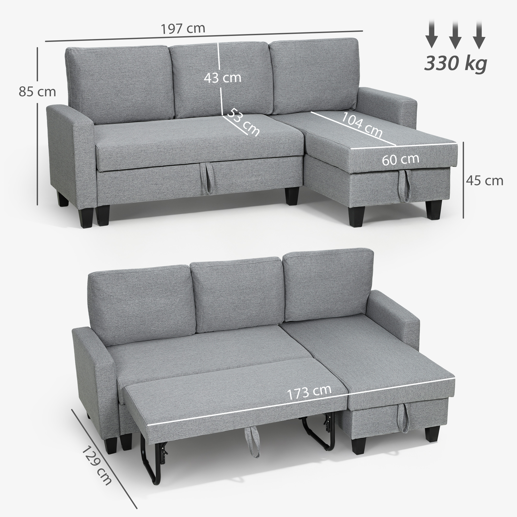 Transforming from a sofa into a guest bed in seconds - this HOMCOM sofa bed is an essential for every home. Plus, it has a discreet compartment in the chaise: storage of soft furnishings and accessories always kept out of sight. Filled with high-density foam, and wrapped in linen-look upholstery, this is a comfortable and soft piece you'll love using - whether that's during the day or night.
