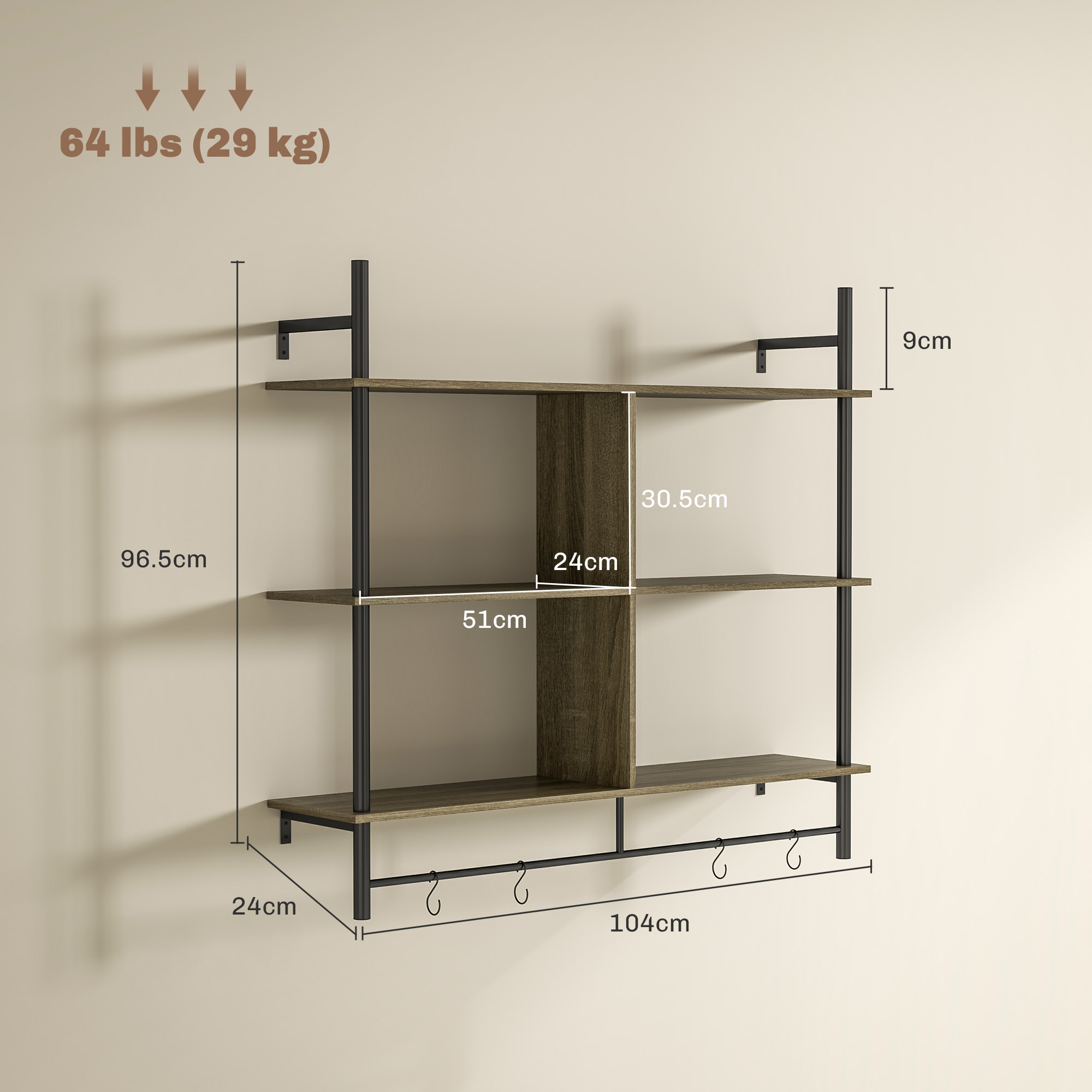 - Weight Capacity: 29kg (total), 8kg (top), 4kg (shelf), 3kg (shelf rod), 0.5kg (hook)