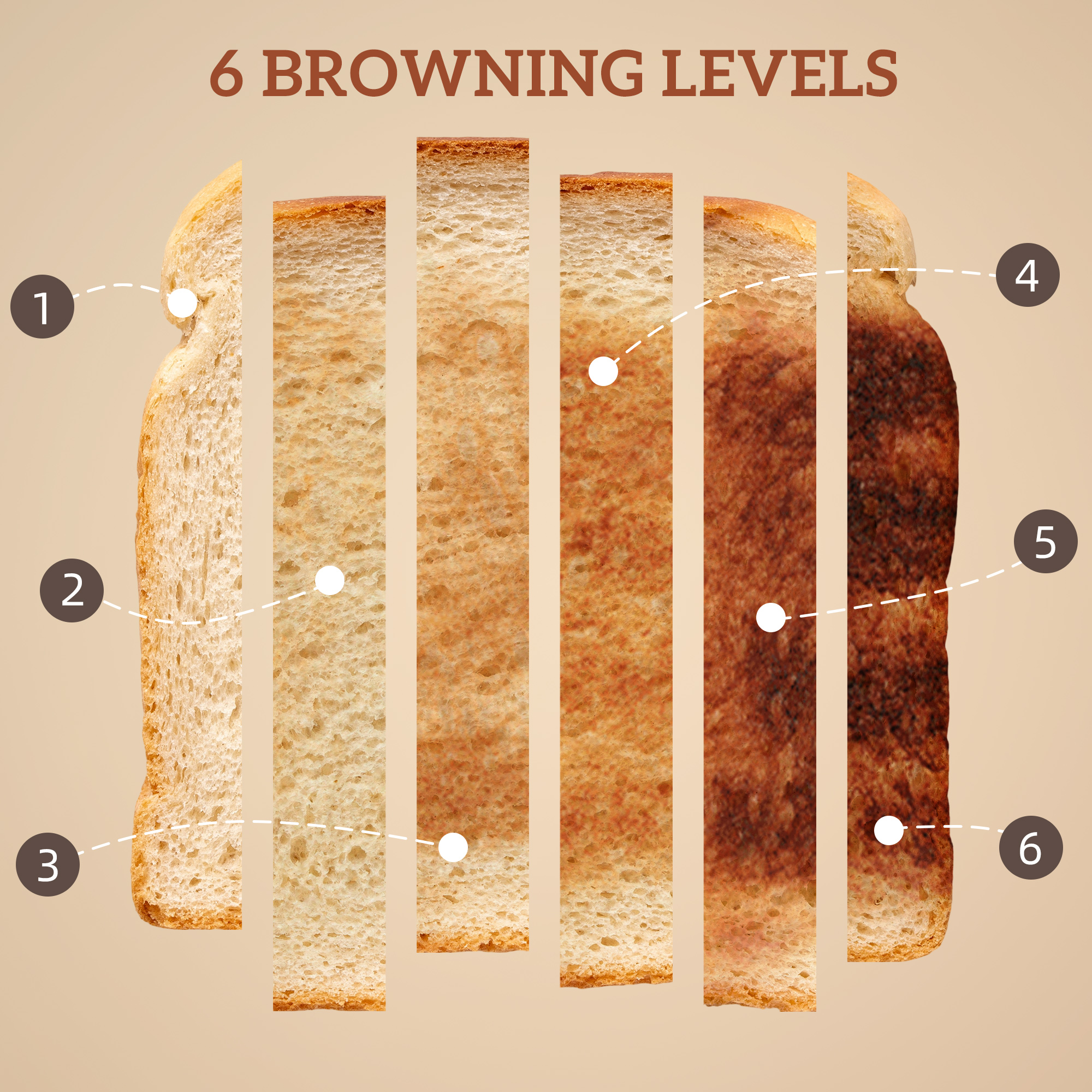 - Two-slice with 6 browning levels and defrost, reheat and cancel