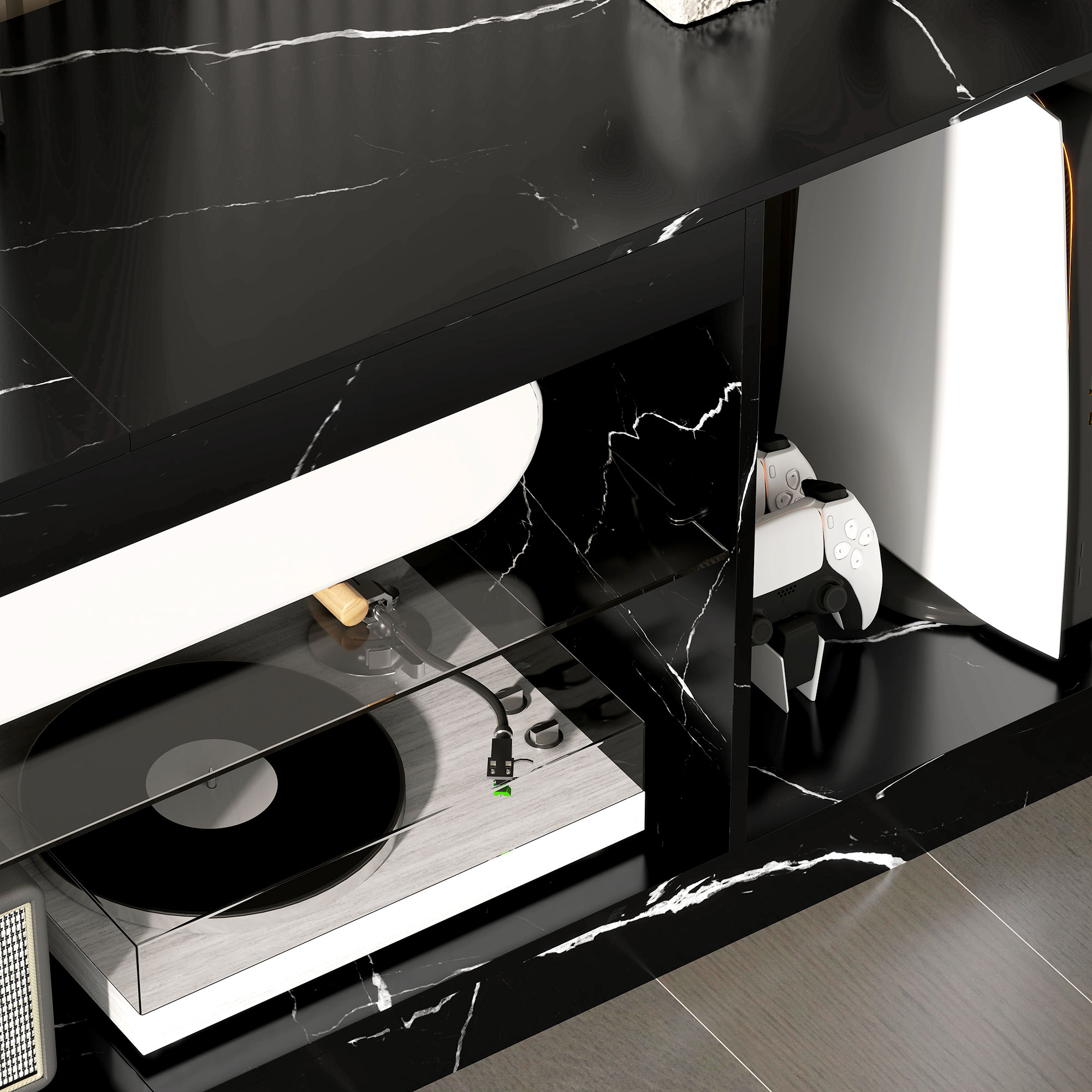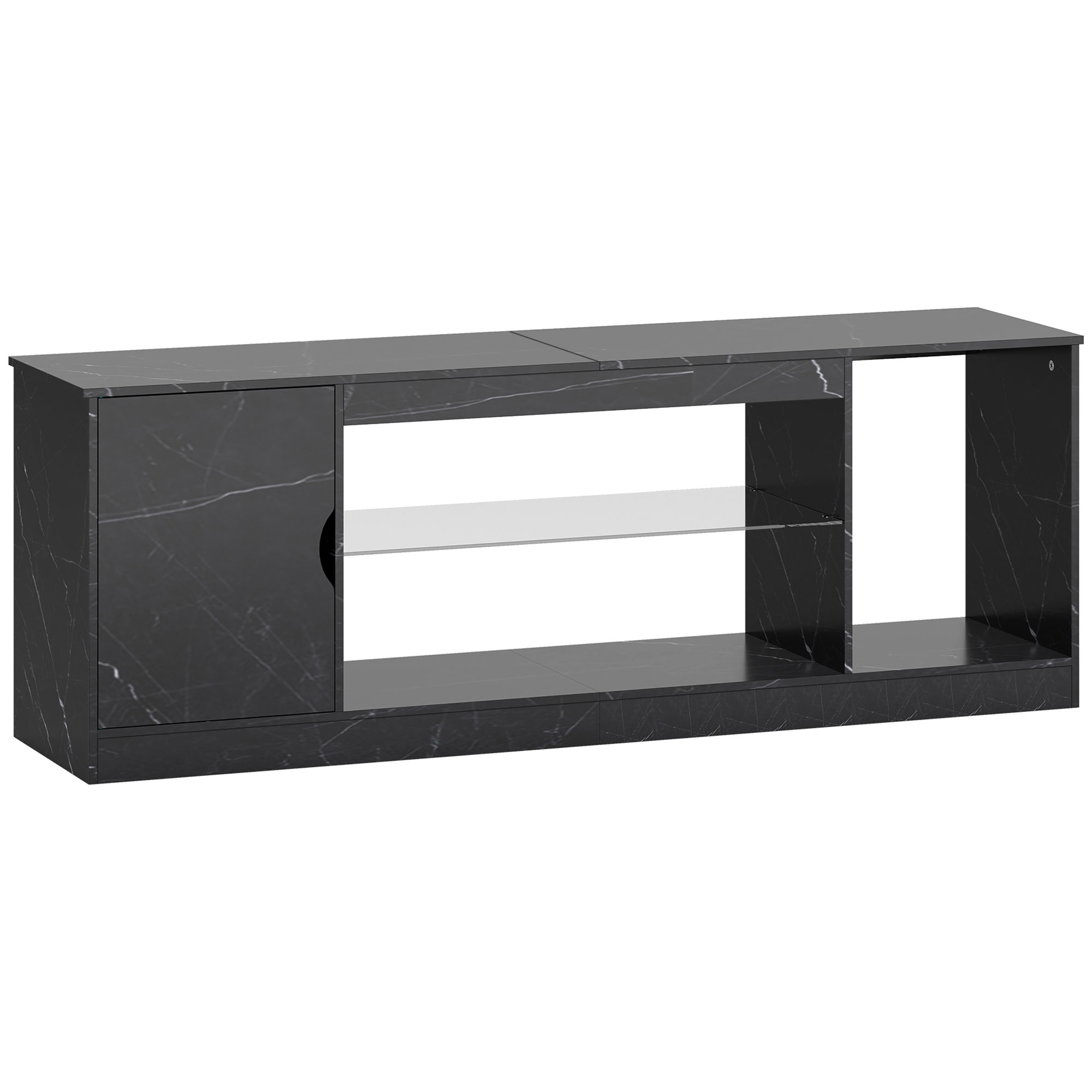 Elevate your living space with the HOMCOM TV stand, showcasing a chic black marble pattern designed for 45" and 55" TVs. This tv cabinet blends style with functionality, offering three open compartments and a hidden cabinet for all your gadgets. Crafted from particle board with a melamine coat, it promises lasting stability and is a breeze to maintain.