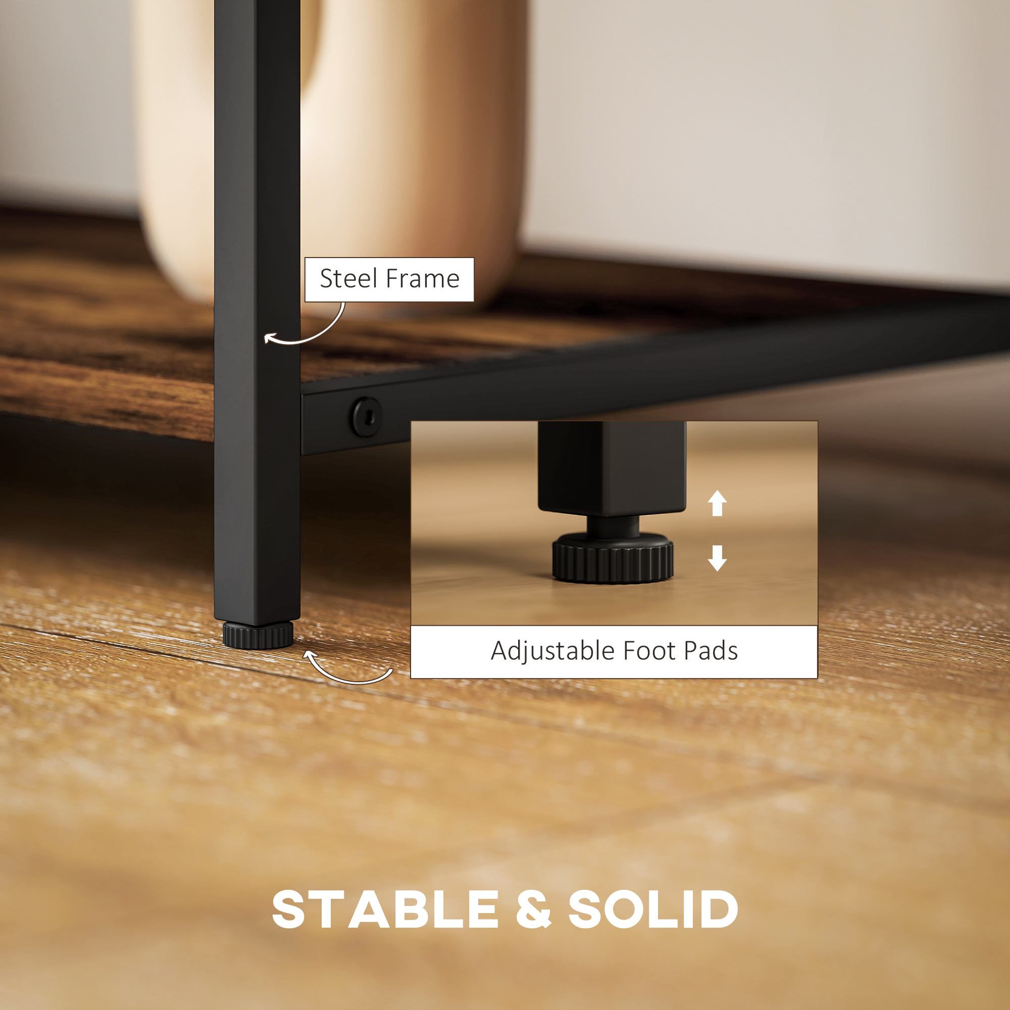 Transform your lounge with the HOMCOM TV console, a stylish hub for all your media essentials. Featuring eight side shelves to display decor and store gadgets and a middle top for up to 55-inch TVs. Its steel frame ensures robust support, while adjustable screw-in feet adapt to uneven floors, ensuring stability and ease of cleaning. Capture the ambiance of a modern farmhouse with this TV console, which perfectly blends industrial black metal with the rich rustic finish.