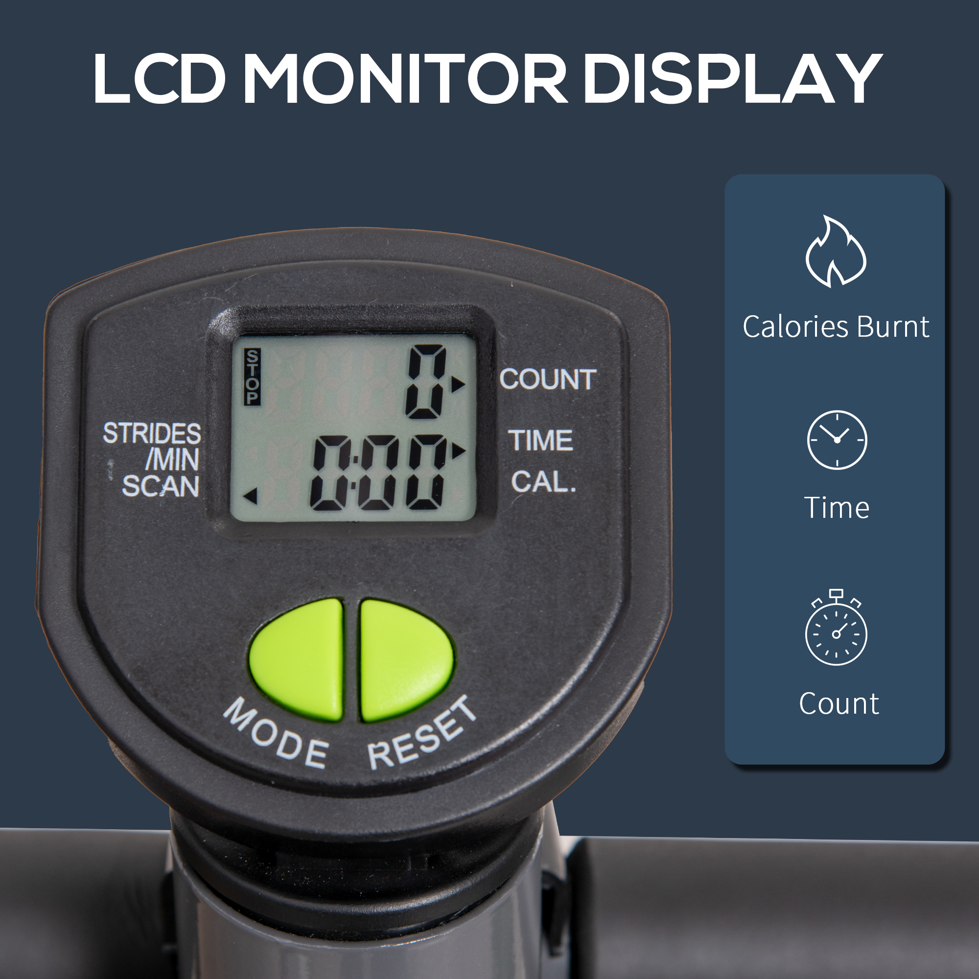 - LCD monitor displays time, step count and calories burnt
